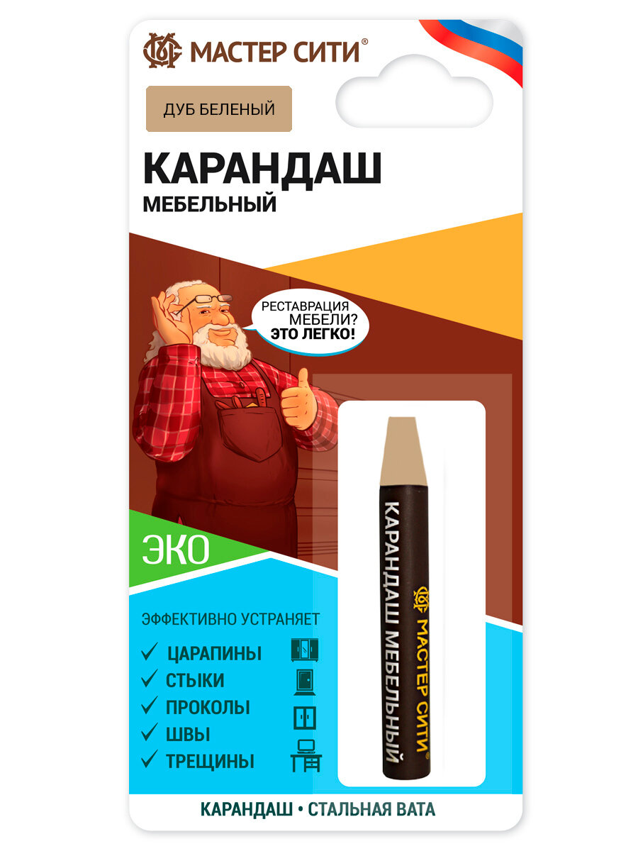 На сегодняшний день товар «Карандаш мебельный Мастер Сити "101 Дуб беленый R" стальная вата в комплекте 6 г» можно купить с кешбеком в 1 магазине: Яндекс.Маркет