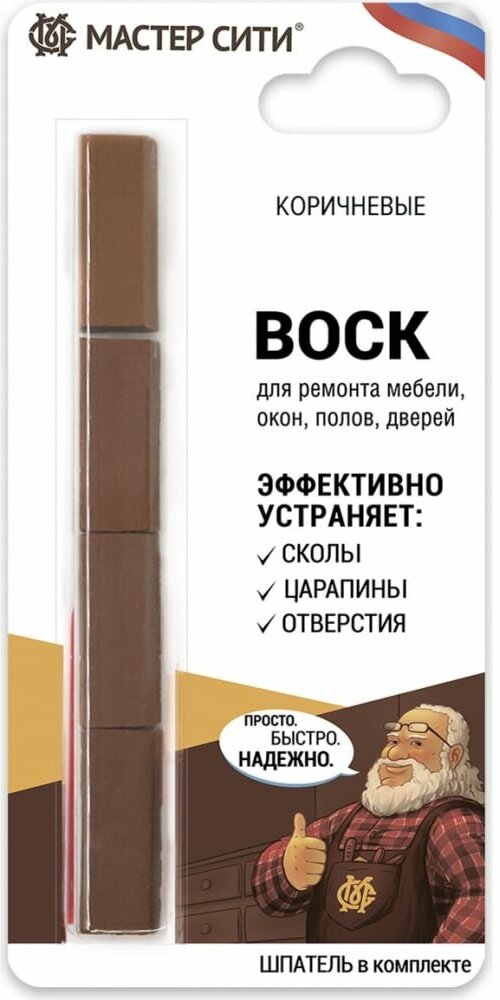 Виды поверхностей:МДФ, ЛДСП, фанера, массив дерева, ламинат, пластик, пробковое покрытие.Виды изделий:Мебель (боковые стенки, фасады), двери, опанелка, окна и т. п.Виды повреждений:Сколы, вмятины, царапины, отверстия, трещины.Размер воска: 3,5 х 1,4 х 1,1 см. - 4,5 . гКомплектация: воск разных тонов - 4 шт; шпатель малый - 1 штука; блистерная упаковка - 1 штука.Свойства: Легок в использовании Мягкий, эластичный, укрывистый Легко колеруется между собой Легко наносится и заполняет повреждения Обладает хорошей адгезией Не дает усадки Образует влагостойкое покрытие Не меняет цвет со временем Прекрасно покрывается лаком Имеет ограниченную механическую прочность Экологичен Рекомендации: Для получения точного оттенка, взять воск 2-3 цветов подходящего тона, и смешать их между собой при помощи газового или аккумуляторного воскоплавителя на стекле или прозрачном пластике, предварительно положив их, для точного колерования, на ремонтируемую поверхность. Для лучшего сцепления и заполнения, затирать воск быстрыми, уверенными движениями, прилагая достаточное усилие, что бы воск при трении размягчился и качественно закрыл повреждение.Хранение: Хранить при температуре не выше +40оС. Избегать попадания прямых солнечных лучей. При соблюдении условий хранения, срок годности не ограничен.