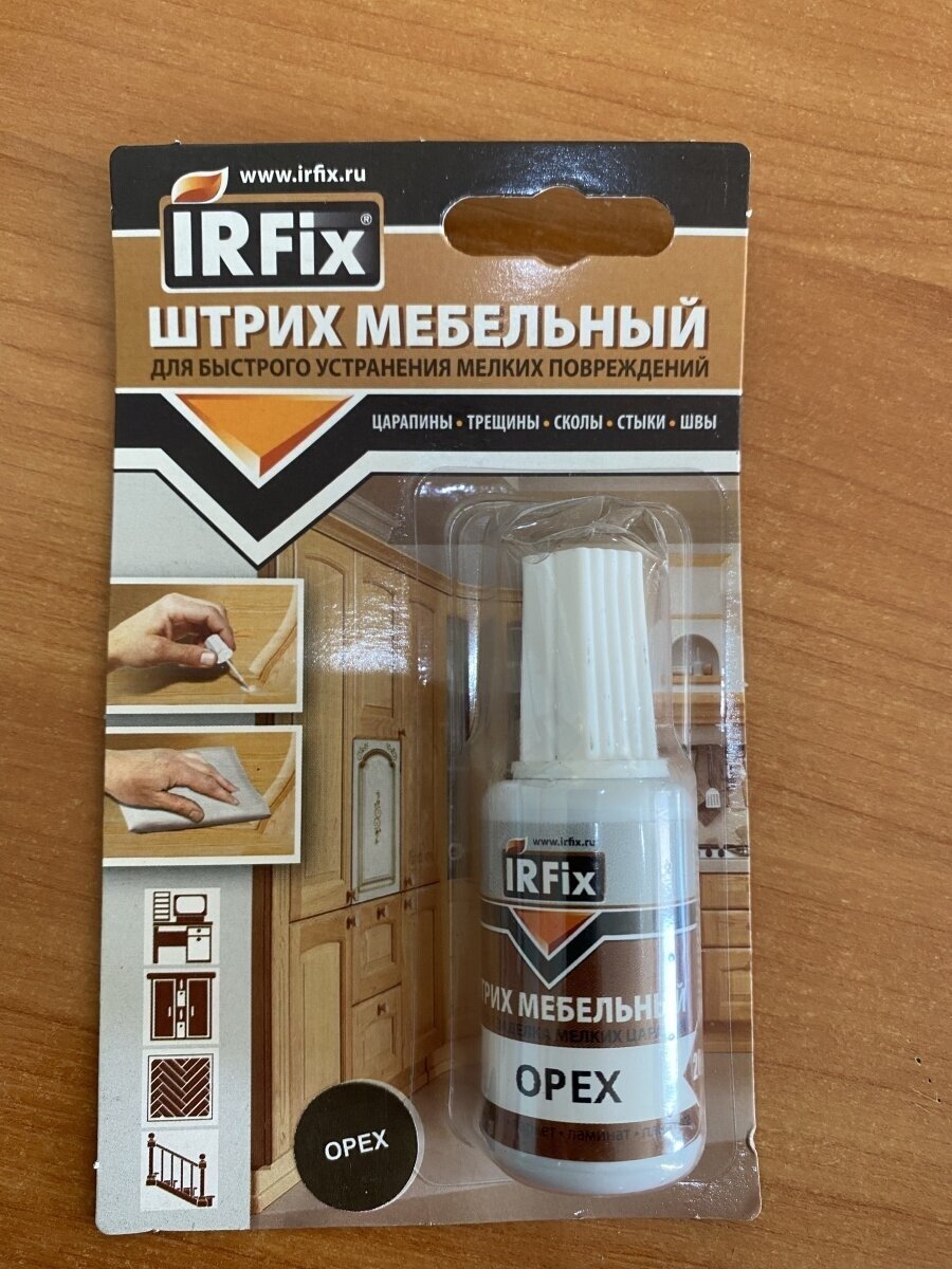 Предназначен для ремонта различных деревянных и пластиковых поверхностей, подверженных интенсивной эксплуатации. Удобен для применения на неровной поверхности и устранении повреждения в труднодоступном месте. Преимущества Великолепно удаляет виды повреждений: сколы, царапины, трещины, стыки, швы. Морозоустойчив. Возможно применять как внутри помещения так и на открытом воздухе. Назначение. Предназначен для быстрой заделки мелких повреждений на деревянных, ламинированных и пластиковых поверхностях, подверженных интенсивной эксплуатации. Подходит для таких видов изделий: мебель, двери, опанелка, плинтуса, окна, столешницы, подоконники, лестницы, полы и т. д. Подходит для поверхностей: ЛДСП, МДФ, ламинат, паркет, плинтуса, фанера, дерево, пластик. Способ применения. Перед использованием флакон тщательно взболтать. Реставрируемую поверхность очистить от пыли, грязи, жирных пятен. Нанести штрих кисточкой тонким слоем на поврежденное место. Время полного высыхания 2 часа.