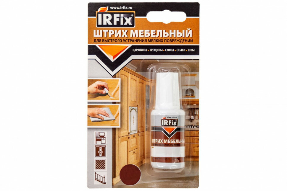 Штрих мебельный IRFixПреимуществаВеликолепно удаляет виды повреждений: сколы, царапины, трещины, стыки, швы.МорозоустойчивВозможно применять как внутри помещения так и на открытом воздухеНазначениеПредназначен для быстрой заделки мелких повреждений на деревянных, ламинированных и пластиковых поверхностях, подверженных интенсивной эксплуатации. Подходит для таких видов изделий: мебель, двери, опанелка, плинтуса, окна, столешницы, подоконники, лестницы, полы и т. д. Подходит для поверхностей: ЛДСП, МДФ, ламинат, паркет, плинтуса, фанера, дерево, пластик.Способ применения Перед использованием флакон тщательно взболтать. Реставрируемую поверхность очистить от пыли, грязи, жирных пятен. Нанести штрих кисточкой тонким слоем на поврежденное место. При необходимости нанести дополнительно 1-2 слоя с промежуточной сушкой 5 мин. Излишки удалить влажной тканью. Время полного высыхания 2 часа.СоставАкриловый лак, пигментная паста, модифицированные добавки.Срок годности 48 месяцев. Хранить флакон плотно закрытым, вдали от источников тепла при температуре от +5 °С до +30 °С.Меры безопасностиДержать в недоступном для детей месте. Не допускать попадания в глаза и дыхательные пути. При попадании на кожу тщательно промыть водой с мылом. Может вызвать аллергические реакции.