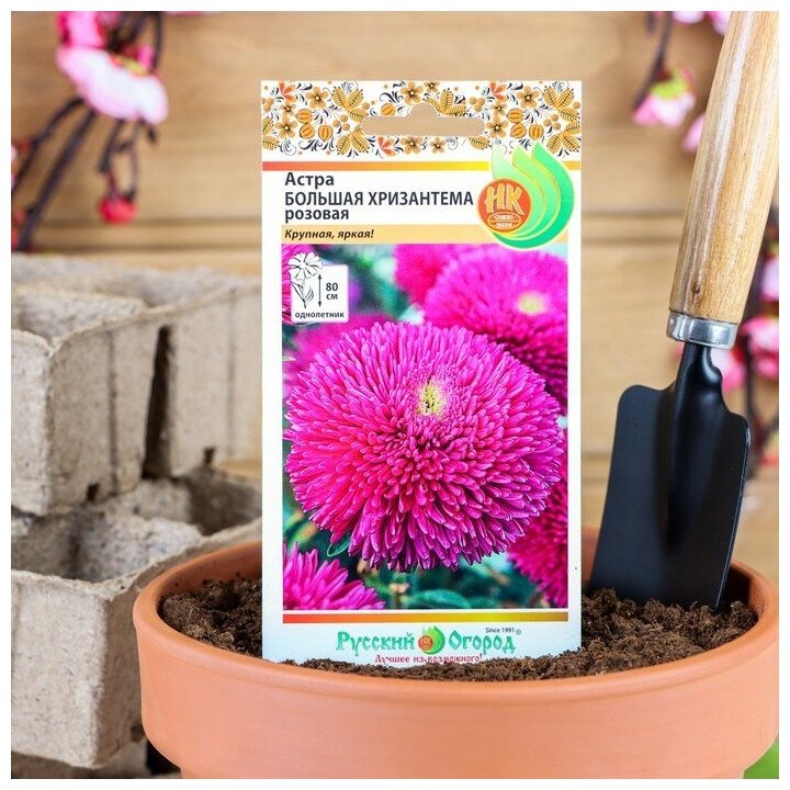 Семена цветов Астра 'Большая хризантема' розовая, серия Русский огород, О, 50 шт. Имеет приземистый, устойчивый куст, состоящий из 20 цветоносов с хризантемоподобными соцветиями. Одно из главных достоинств — абсолютная транспортабельность. Цветы в роспуске имеют крепкие лепестки, которые не теряют своего вида и не ломаются при транспортировке. Отлично сохраняется в срезке: до двух недель стоит в вазе.Для раннего цветения следует проводить посев на рассаду в лёгкую, предварительно обеззараженную почву. При глубине заделки семян в 5 мм и оптимальной температуре 18–20 градC ростки появляются в течение 7 дней. Пикировка делается в стадии 2–4 настоящих листьев. Высаживается в открытый грунт на солнечное место с хорошо дренированной почвой.(4073346)