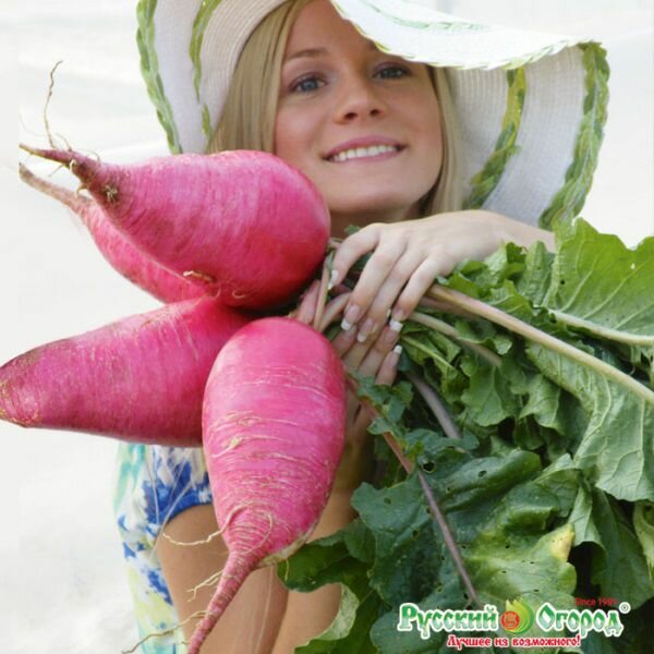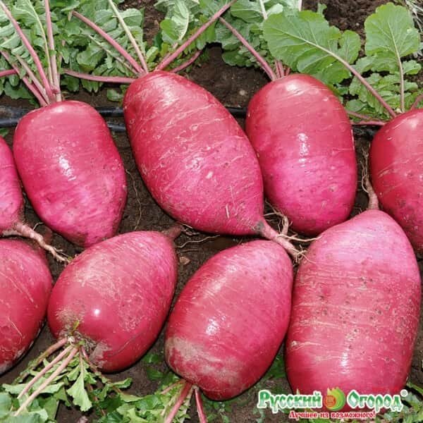 Сверхредиска F1 славится огромными размерами плодов – один такой корнеплод весит до 2 килограмм! Окрас плодов насыщенно-розовый, но мякоть внутри белая. Сверхредиска F1 отличается повышенным содержанием сахара в плодах, поэтому он совмещает очень необычные вкусовые характеристики: и пикантность, и сладость.