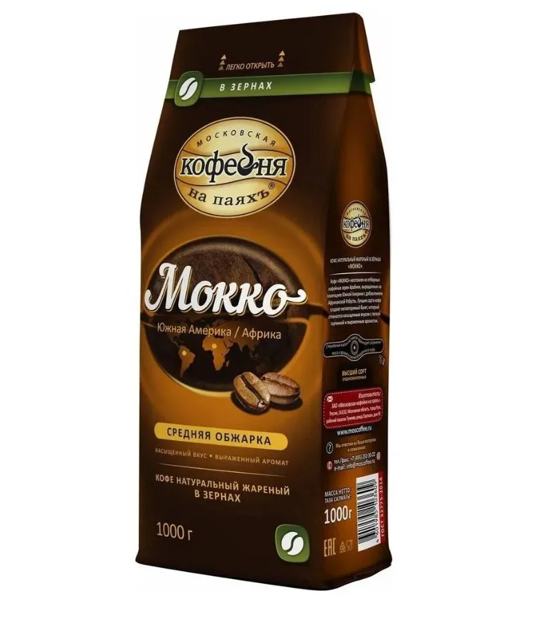 Кофе Московская кофейня на паяхъ Мокко в зернах с винтовой крышкой, 1кг ? Кофе натуральный жареный в зернах Московская кофейня на паяхъ "Мокко". Изготовлен из отборных кофейных зерен арабики, выращенных на плантациях Центральной и Южной Америки с добавлением Африканской Робусты. Лучшие сорта кофе создают неповторимый букет, который отличается насыщенным вкусом с легкой горчинкой и выраженным ароматом. Специальный клапан на пакете гарантирует сохранение вкуса и аромата свежеобжаренного кофе. Благородная горчинка и легкие шоколадные нотки в его вкусе непременно понравятся ценителям кофе? Состав: смесь арабики и робусты? Степень обжарки: средняя? Способ приготовления: размолоть кофейные зерна, залить кипятком из расчета одна-две чайные ложки кофе на одну чашку. Довести до кипения. Сахар и сливки добавить по вкусу? Вес: 1000 г? Тип упаковки: вакуумный пакет? Условия хранения: плотно закрытый пакет хранить в сухом прохладном месте? Страна производства: Россия? ГОСТ 32775-2014? Степень обжарки средняя объем 2925 куб. см вес брутто 1 кг вес нетто товара 1 кг Срок хранения от даты производства (месяцев) 18 Сорт зерна смесь арабики и робусты Вес, г 1000 Тип упаковки вакуумный пакет Страна происхождения Россия