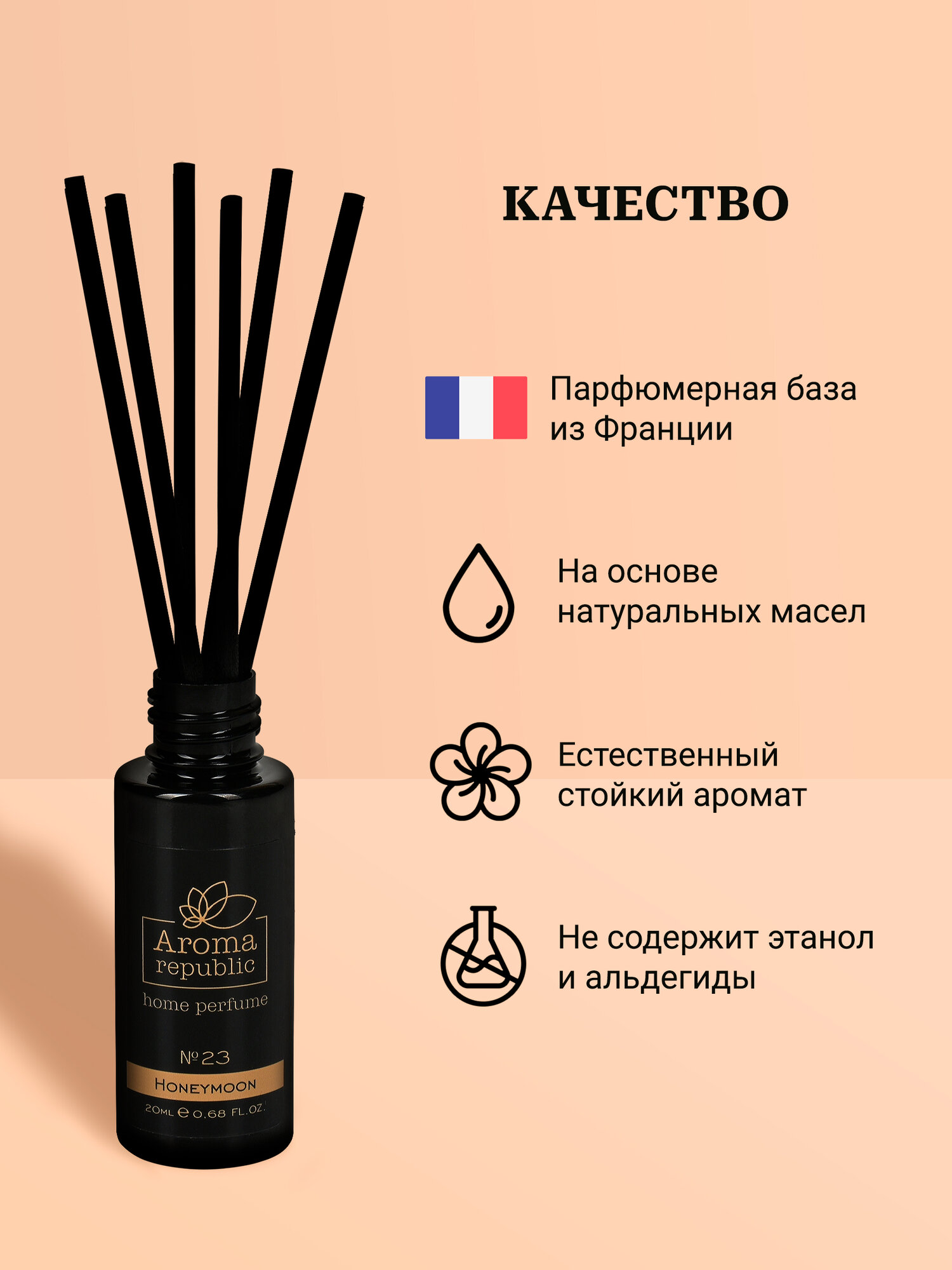Ароматизатор Aroma Republic зачаровывает шлейфом фруктово-пряных нот с аккордами жасмина, ванили и пралине. Вы можете использовать ароматизаторы Aroma Republic в жилых помещениях, офисах, салонах красоты, магазинах. Это безопасный и экологически чистый способ ароматизации помещения. При производстве используется 100% швейцарское и французское сырье. Ароматы не содержат спирта, поэтому в несколько раз дольше работают и мягко отдают аромат в отличие от спиртовых. Интенсивность запаха можно регулировать количеством палочек,- чем их больше, тем сильнее аромат. Для лучшей ароматизации, рекомендуем чаще переворачивать палочки, желательно раз в сутки. Изделие рассчитано на помещение до 15 м2. Начальные ноты: сочетание пралине и ванили;Ноты сердца: яблоко, груша;Основные ноты: жасмин и сандал