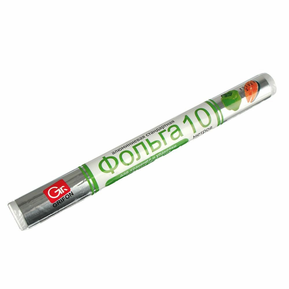 В одной упаковке фольга размером: ширина 29 см, длина 5 м. Пищевая алюминиевая фольга толщиной 9 мкм, предназначена для упаковки бутербродов, готовых блюд с целью долговременного хранения и/или транспортировки. Использование фольги GRIFON позволяет продуктам сохранять свежесть и не допускает смешивания запахов при хранении.