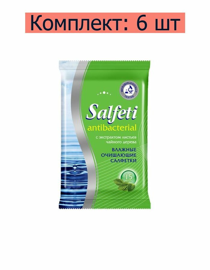 В комплекте 6 упаковок. Влажные антибактериальные салфетки Salfeti незаменимы дома, в офисе и поездках. Обладают мощным антибактериальным действием. Убивают 99,9% микробов. Надежно защищают кожу от бактерий. Содержат экстракт листьев чайного дерева.Салфетки изготовлены из спанлейса. В составе – не менее 50% вискозы. Ткань – плотная, одновременно, приятна к коже. Удаляет любые загрязнения. Сохраняет естественный уровень pH кожи.Салфетки Salfeti подходят для всех членов семьи, включая детей.