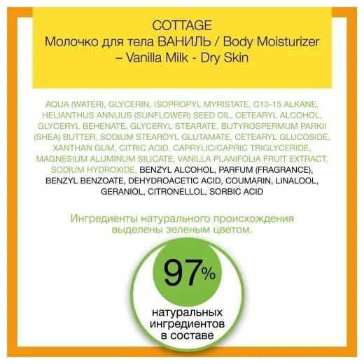 | Химический состав | Aqua (Water), Glycerin, Isopropyl Myristate, C13-15 Alkane, Helianthus Annuus (Sunflower) Seed Oil, Cetearyl Alcohol, Glyceryl Behenate, Glyceryl Stearate, Butyrospermum Parkii (Shea) Butter, Sodium Stearoyl Glutamate, Cetearyl Glucoside, Xanthan Gum, Citric Acid, Caprylic/Capric Triglyceride, Magnesium Aluminum Silicate, Vanilla Planifolia Fruit Extract, Sodium Hydroxide, Benzyl Alcohol, Parfum (Fragrance), Benzyl Benzoate, Dehydroacetic Acid, Coumarin, Linalool, Geraniol, Citronellol, Sorbic Acid |
