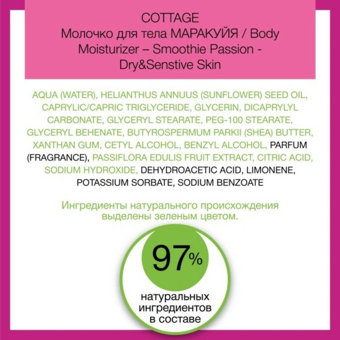 | Химический состав | Aqua (Water), Helianthus Annuus (Sunflower) Seed Oil, Caprylic/Capric Triglyceride, Glycerin, Dicaprylyl Carbonate, Glyceryl Stearate, Peg-100 Stearate, Glyceryl Behenate, Butyrospermum Parkii (Shea) Butter, Xanthan Gum, Cetyl Alcohol, Benzyl Alcohol, Parfum (Fragrance), Passiflora Edulis Fruit Extract, Citric Acid, Sodium Hydroxide, Dehydroacetic Acid, Limonene, Potassium Sorbate, Sodium Benzoate |