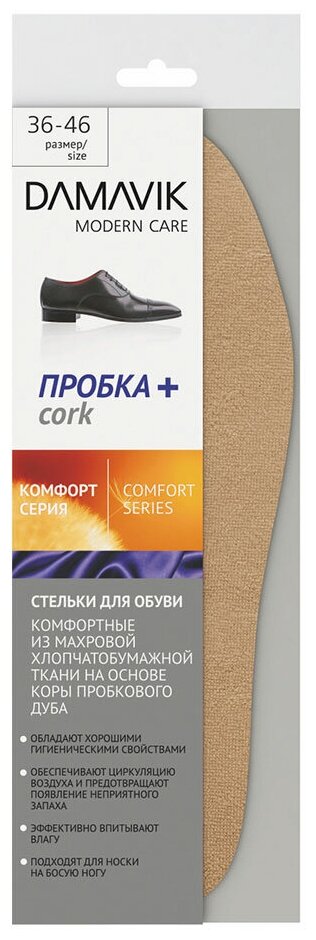 Обладают хорошими гигиеническими свойствами. Обеспечивают циркуляцию воздуха. Великолепно впитывают влагу. На длительное время предохраняют от появления неприятного запаха. Кора пробкового дуба обладает уникальными гигиеническими свойствами, это — экологически чистый продукт. Натуральная пробка, даже находясь во влажной агрессивной среде, способна столетиями не подвергаться гниению и препятствовать образованию грибка. Достаточная жесткость и упругость материала с учетом предлагаемой толщины, обеспечит защиту внутренней поверхности подошвы на длительное время. Термоизоляционные свойства натуральной пробки позволяют сохранять внутри обуви комфортную температуру, как в жаркое, так и в холодное время года. Эффект «термоса», который может длительное время хранить как кипяток, так и лед. Идеальный вариант для тех, кто любит носить обувь «босиком».