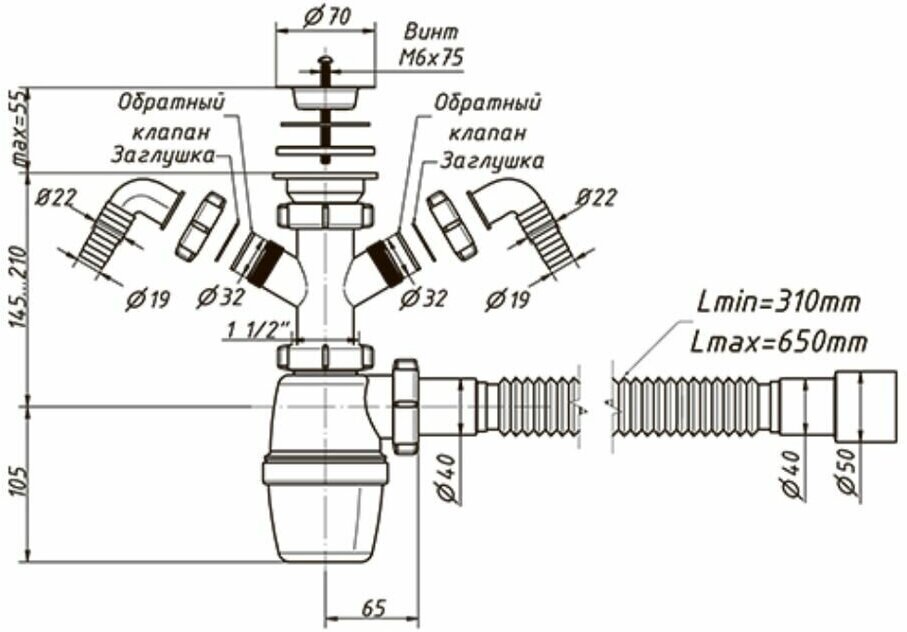| Особенности | В комплекте идет полированная нержавеющая чашка д70 мм. Сифон комплектуется нержавеющим винтом длиной 75 мм и нержавеющей гайкой М6. Гибкий отвод позволяет подключить слив сифона к канализации с диаметрами 40 или 50 мм. Отвод для подключения стиральной/посудомоечной машины имеет два штуцера с диаметрами подключения 19 и 22 мм. Так же имеются заглушки отвода подключения бытовой техники, на случай его не использования. |