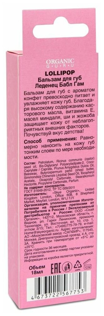 | Полное наименование | бальзам для губ organic guru lollipop, 18 мл |