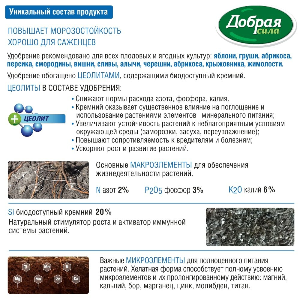 Удобрение Добрая сила рекомендовано для плодовых и ягодных культур: яблони, груши, абрикоса, персика, смородины, вишни, сливы, алычи, черешни, крыжовника, жимолости. Удобрение обогащено цеолитами, содержащими биодоступный кремний.