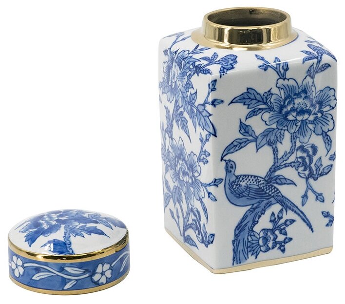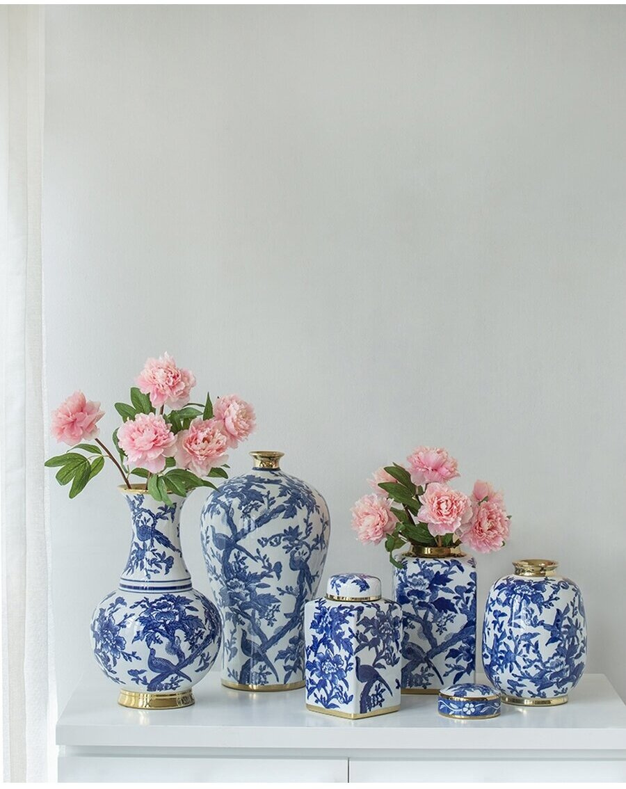 Золотая кайма вокруг крышки или горла — распространенный способ подчеркнуть красоту стиля шинуазри. Бело-голубая отделка придает этому изделию классический акцент. Поставьте ее на консольный столик для придания ему элегантности.