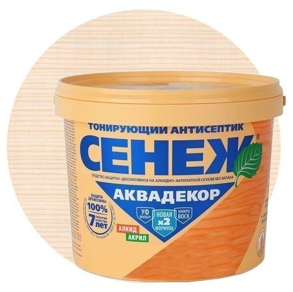 Антисептик СЕНЕЖ АКВАДЕКОР предназначен для долговременной защиты древесины от атмосферных осадков, плесневых, деревоокрашивающих и дереворазрушающих грибов, водорослей и насекомых-древоточцев, а также декоративной отделки под ценные породы. Сочетание в СЕНЕЖ АКВАДЕКОР алкидов, акрилатов и льняного масла улучшает проникновение в древесину, формирует эластичное дышащее защитное покрытие с мягким шелковистым блеском.