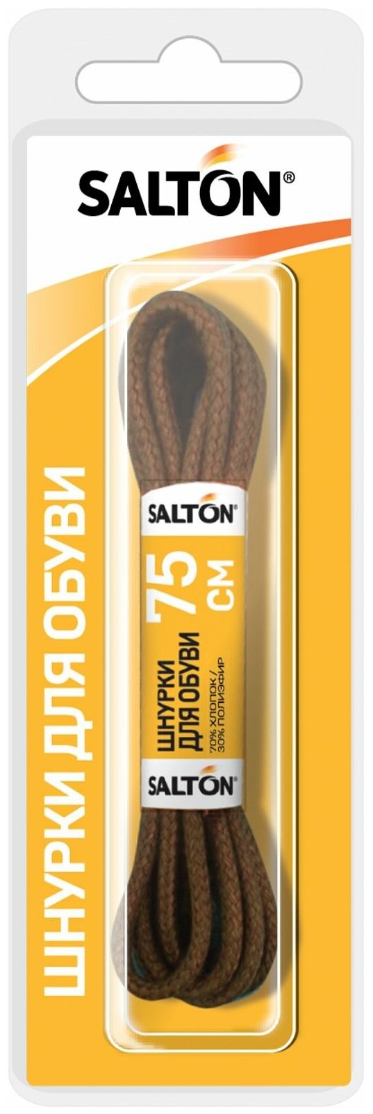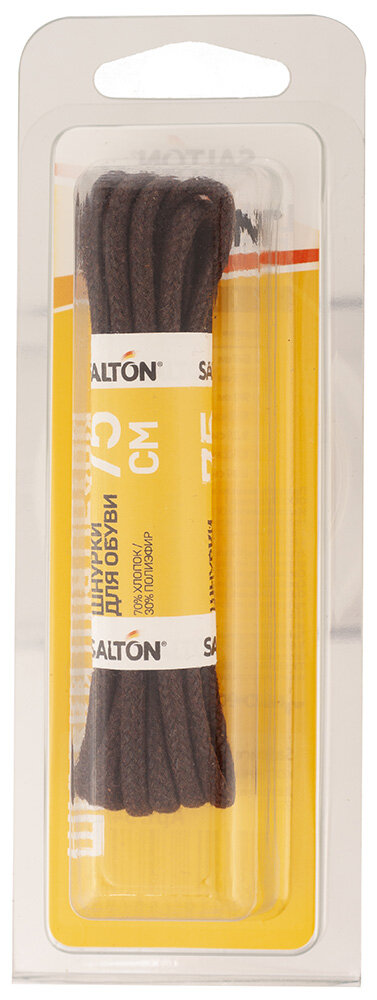 Часто мы не уделяем должного внимания такой маленькой обувной детали, как шнурки. А зря: обувные шнурки выполняют важную функцию, фиксируя ногу в ботинке и, соответственно, обеспечивая комфорт при ходьбе.Очень часто родные шнурки даже самой качественной обуви доставляют массу проблем: могут быстро порваться, распушиться или просто постоянно развязываются, доставляя нам дискомфорт. Чтобы избежать этих проблем, приобретайте шнурки для обуви с пропиткой Salton.Шнурки изготовлены из 1% натурального хлопка. Восковая пропитка этих шнурков для обуви придает им повышенную прочность и увеличивает срок службы. Также такие шнурки отлично фиксируют узел и не развязываются во время ходьбы.Шнурки коричневые круглые имеют длину 75 см, они отлично подойдут для любой классической обуви. Не тратьте деньги, постоянно меняя шнурки, купите шнурки Salton один раз и обеспечьте себе комфортные прогулки надолго.