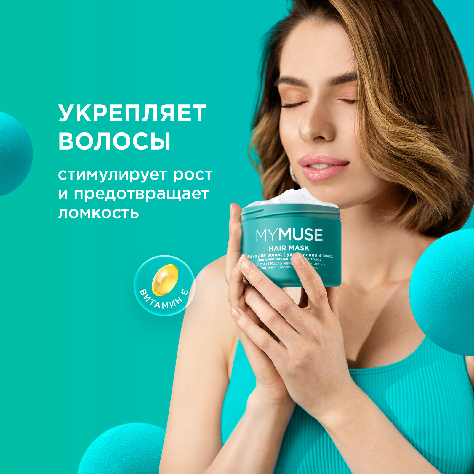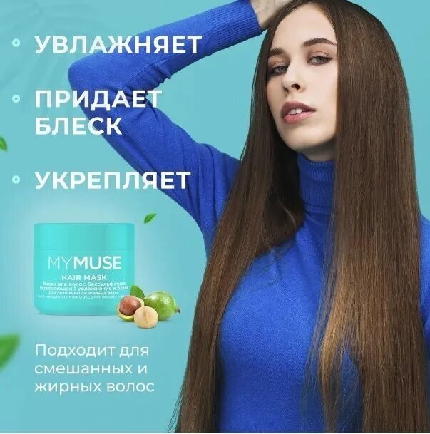 Маска от MY MUSE обеспечивает защиту волосам от неблагоприятных и агрессивных погодных условий. Придает локонам естественный блеск. Подходит для ежедневного применения. Маску легко применять в домашних условиях.