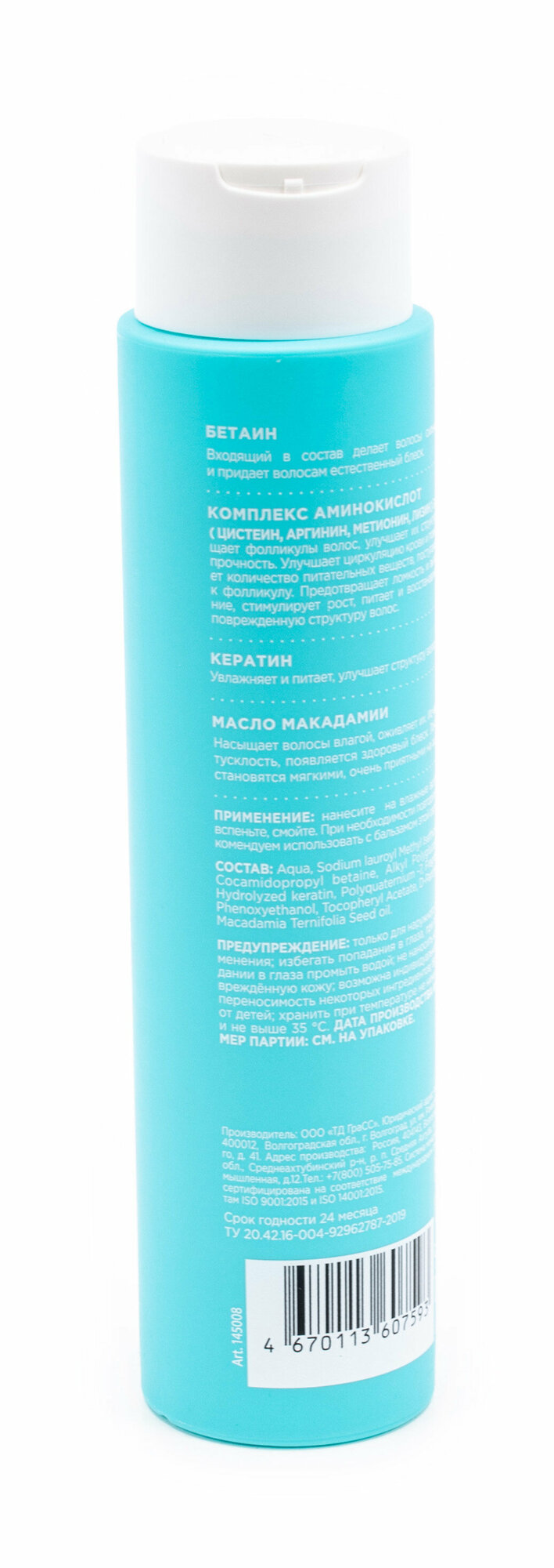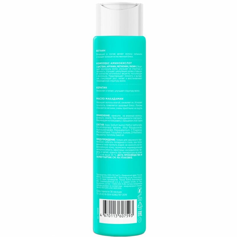 | Химический состав | Aqua, Cetearyl Alcohol, Cetrimonium Chloride, Propylene Glycol, Polyquaternium-7, Caprylic/Capric Triglyceride, Dicocoylethyl Hydroxyethylmonium Methosulfate, Amodimethicone, Fragrance, Phenoxyethanol, Tocopheryl Acetate, Hydrolized keratin, D-Panthenol, Macadamia Ternifolia Seed oil, Hydrolized milk protein. |