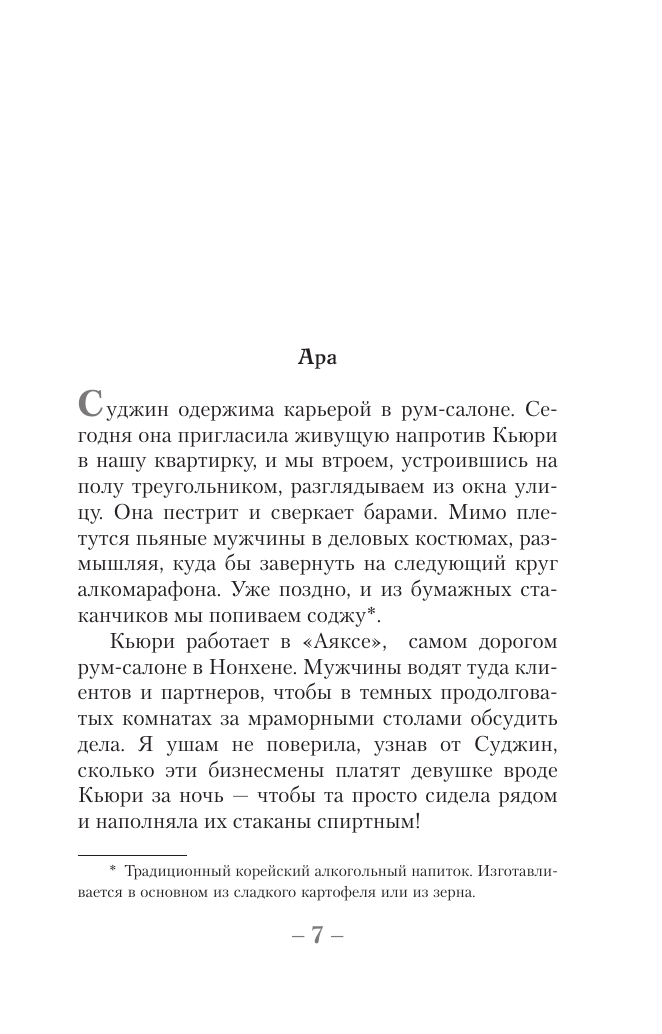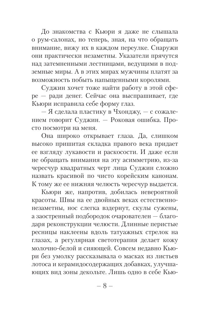 Эту комнату снимает Кьюри. Она работает в рум-салоне — так в Южной Корее скромно называют клубы, где мужчины из высших кругов могут выпить в приятной компании красивых девушек, а потом, возможно, продолжить с ними вечер в гостиничном номере. Однажды сделав пластическую операцию, Кьюри больше не может остановиться. Если ты некрасива в этой стране, у тебя просто-напросто нет будущего.