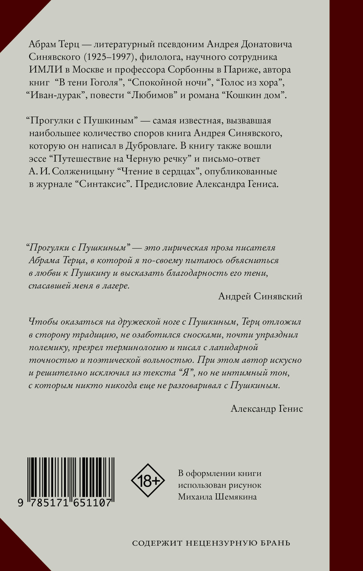 “Прогулки с Пушкиным” — самая известная, вызвавшая наибольшее количество споров книга Андрея Синявского, которую он написал во время заключения в Дубровлаге. В книгу также вошли эссе “Путешествие на Черную речку” и письмо-ответ А.И.Солженицыну “Чтение в сердцах”, опубликованные в журнале “Синтаксис”.
