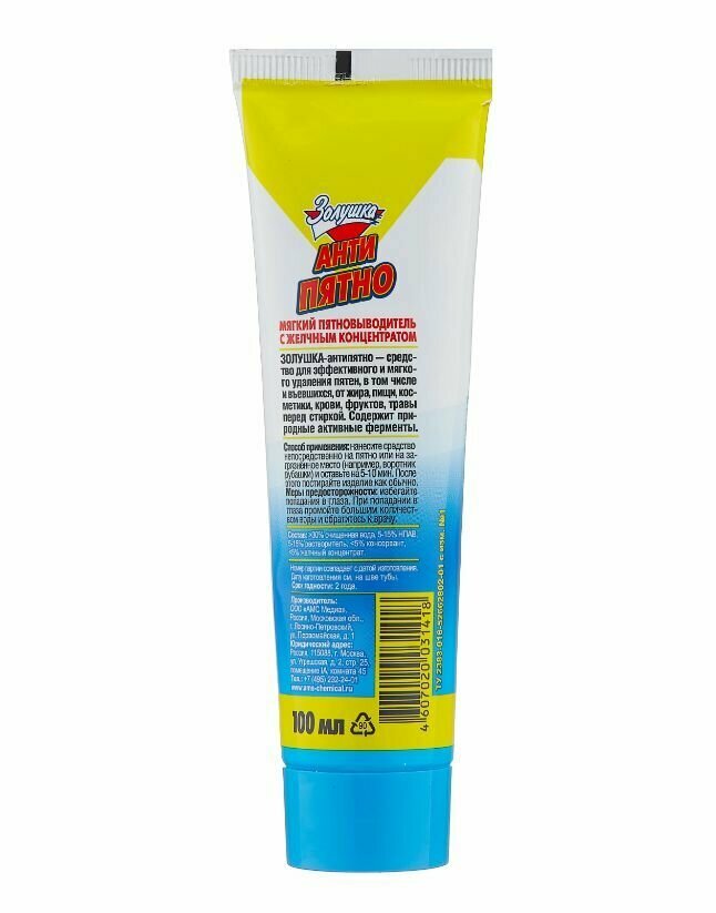 Антипятно эффективное средство для выведения пятен от масложировых загрязнений, косметических средств, крови, жвачки, травы, в том числе застарелых и въевшихся, с текстильных изделий, ковров, обивки мягкой мебели и салона автомобиля перед непосредственной очисткой поверхности или стиркой. Содержит природные активные ферменты. Мягкий пятновыводитель содержит желчный концентрат.