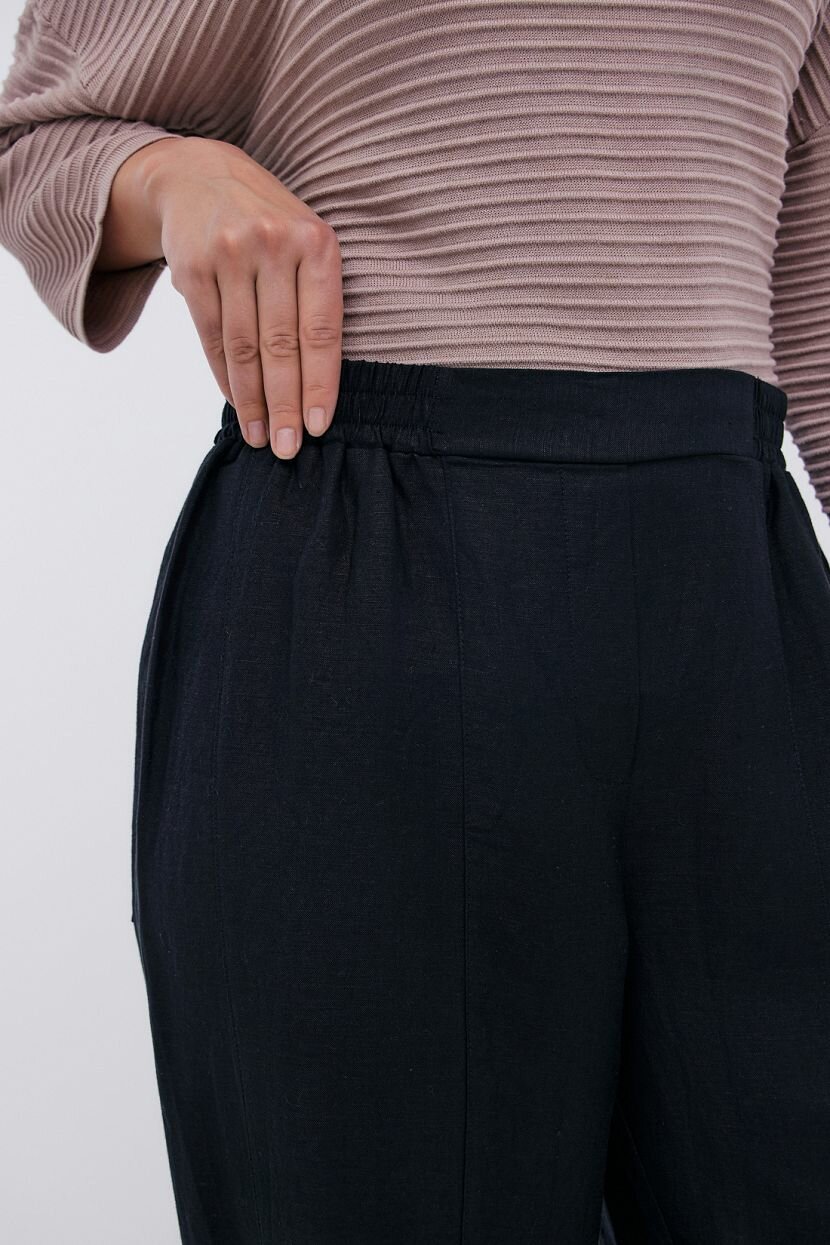 Лёгкие брюки-бананы станут комфортным выбором для жаркой погоды. Модель без застёжки имеет широкий эластичный пояс, который мягко садится по фигуре и подстраивается под её особенности. Нижние части штанин завершаются пришивными манжетами, благодаря чему брюки хорошо удерживают форму. Продольные рельефные швы визуально вытягивают фигуру. Брюки дополнены двумя накладными карманами сзади.Модель выполнена из полностью натурального полотна. Лён и вискоза обладают дышащим и гипоаллергенным эффектом, а также придают материалу выразительную фактуру. Натуральные ингредиенты обеспечат комфортное отведение влаги с поверхности кожи и подарят ощущение прохлады. Обратите внимание: натуральные волокна могут дать усадку при стирке, поэтому стирайте брюки в прохладной воде.