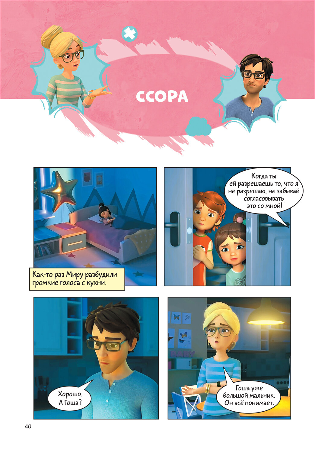 Любимый мультсериал теперь в формате комиксов! Как и все дети, брат и сестра Гоша и Мира познают мир, играют, иногда ссорятся и попадают в трудные ситуации: дома, в школе или во дворе. Что делать, если тебя обижают? Как справиться со злостью? Почему плакать совсем не стыдно? Как научиться общаться и завести новых друзей? На эти и другие важные вопросы Мире и Гоше помогают ответить мама и папа. А комментарии психолога к каждой истории помогут вам вместе с ребенком разобрать проблему, проговорить важные моменты и обсудить, как действовать в сложной ситуации.