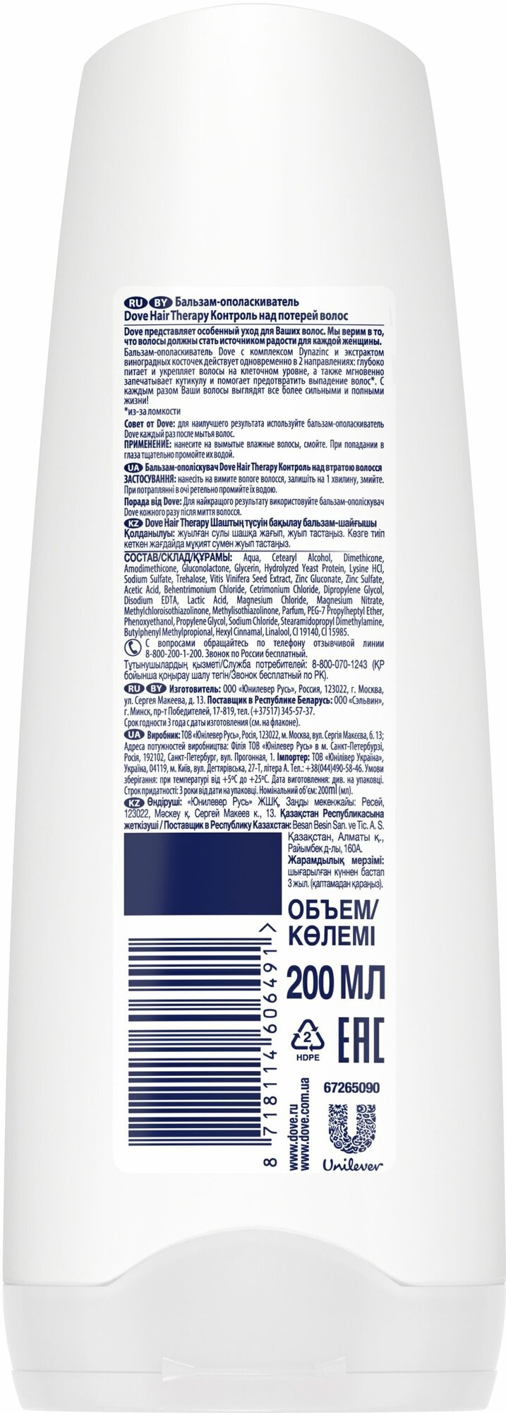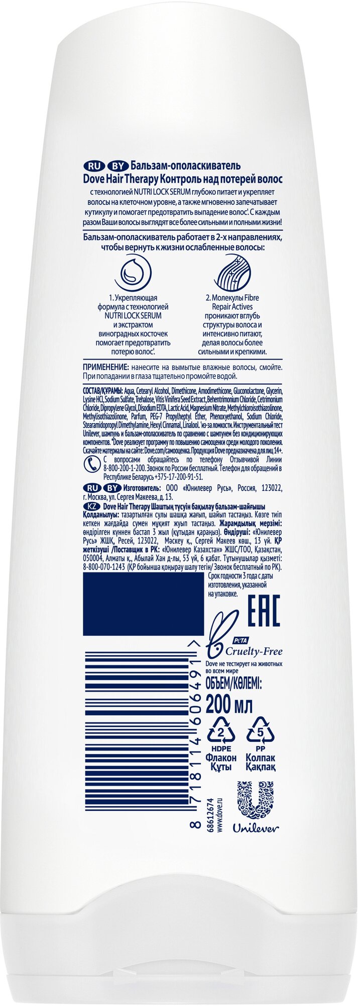 Бальзам Dove Hair Therapy Контроль над потерей волос мягко и бережно очищает хрупкие волосы, эффективно укрепляет их, помогая предотвратить ломкость. Увлажняющая микро-сыворотка, входящая в состав бальзама-ополаскивателя, разглаживает поврежденную поверхность волоса, помогая восстановить и укрепить ослабленные ломкие волосы от корней до кончиков, уменьшая потерю волос на 98%.