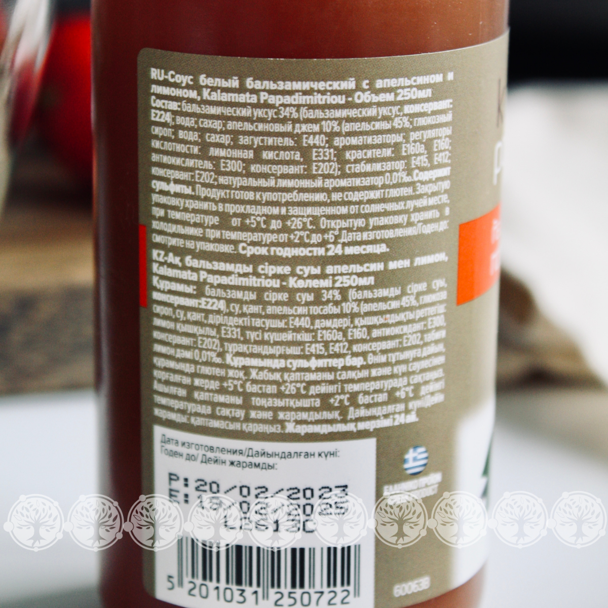 | Состав | Бальзамический уксус 24% (бальзамический уксус, белый бальзамический уксус 34% (бальзамический уксус, консервант: Е224), вода, сахар. Апельсиновый джем 10% (апельсин, сахар, сироп, загуститель: пектин, антиокислитель |
