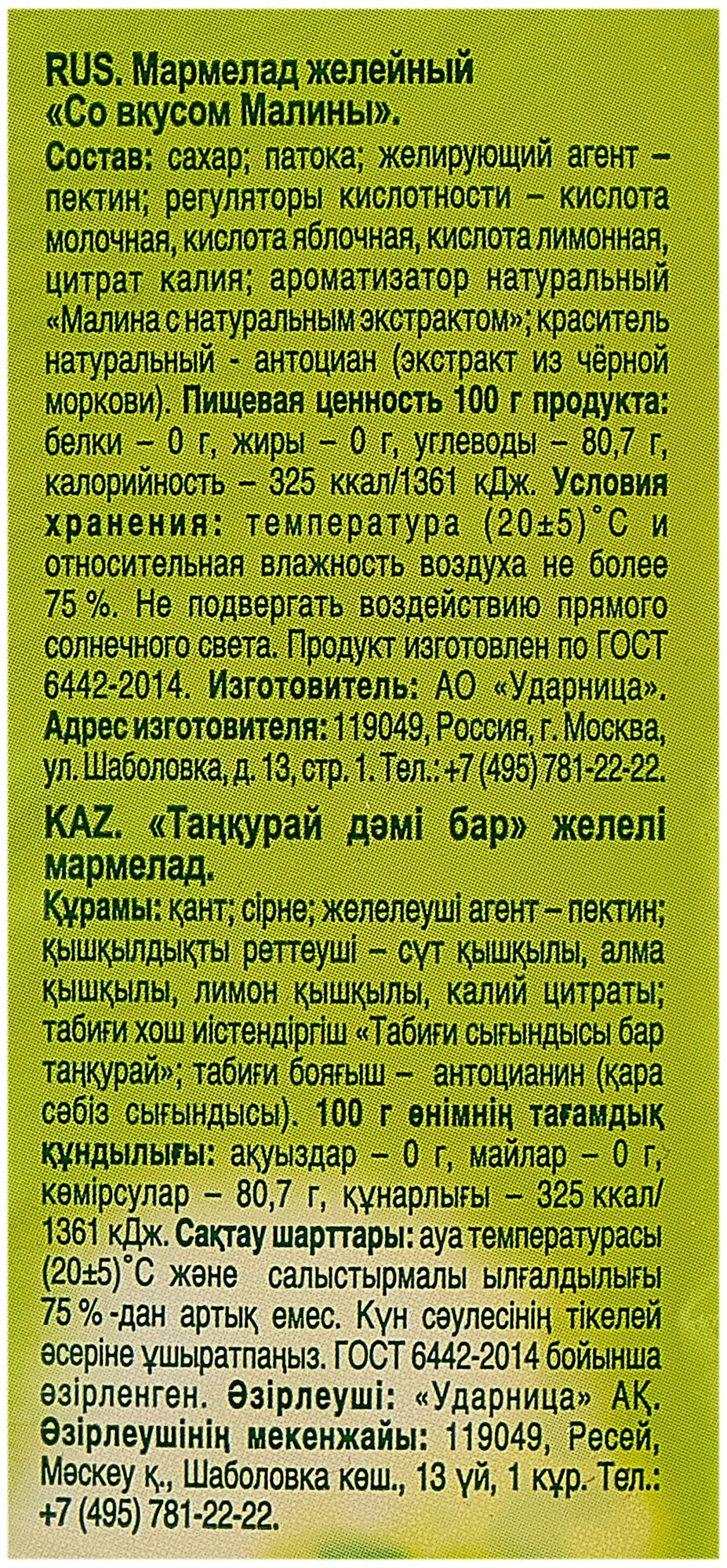 | Состав | Сахар-песок; патока; желирующий агент - пектин; регуляторы кислотности - кислота молочная, кислота яблочная, кислота лимонная, цитрат натрия; ароматизатор; краситель натуральный – экстракт черной моркови |