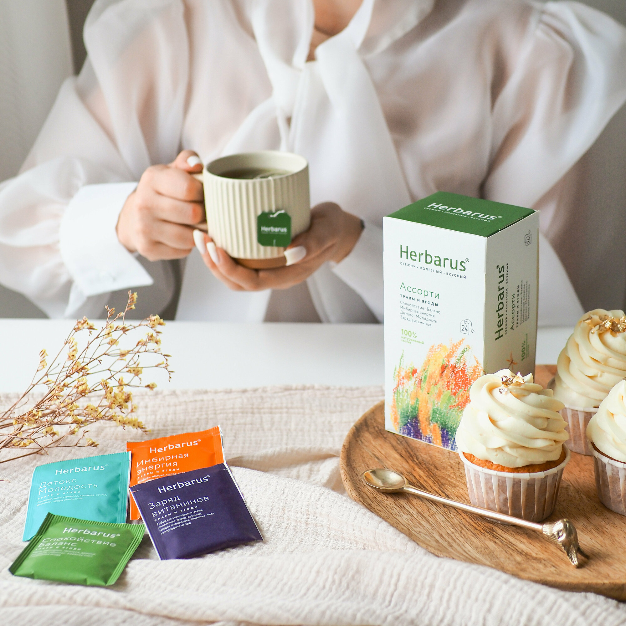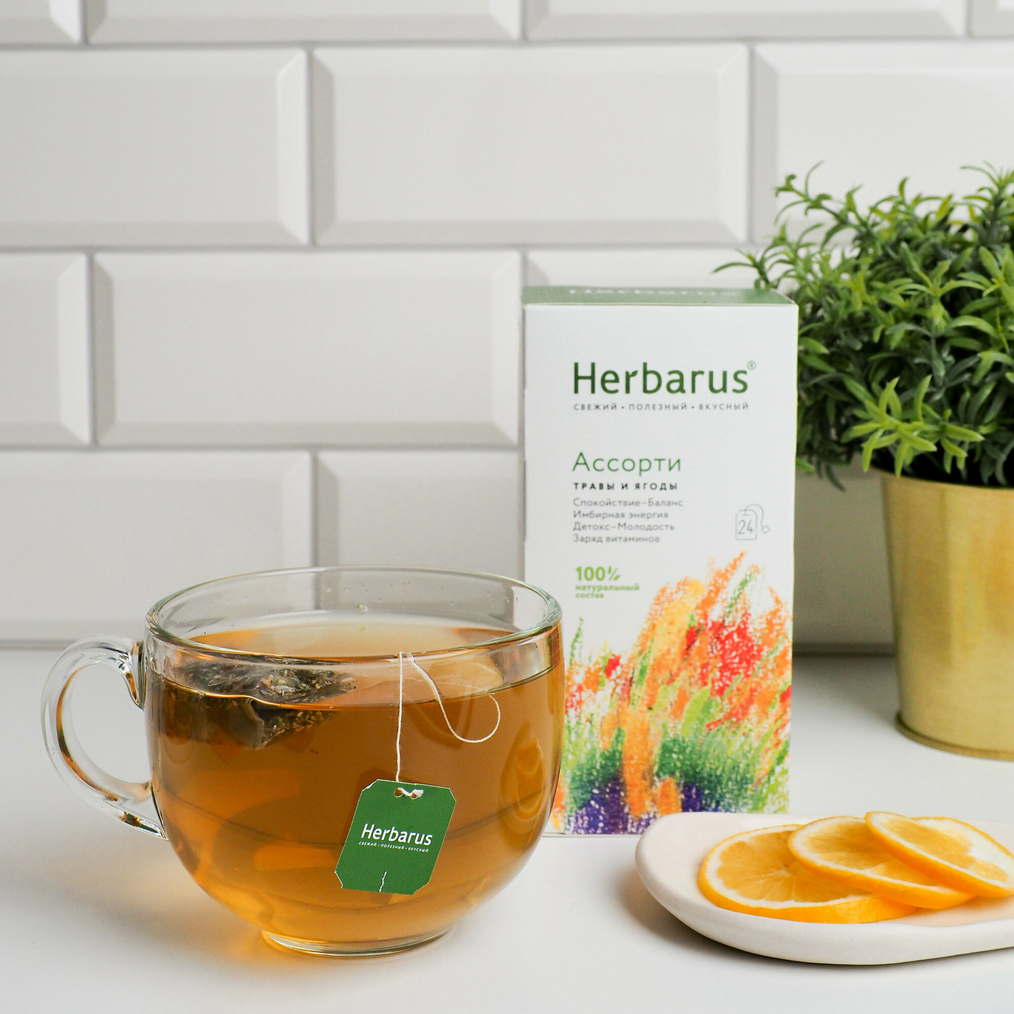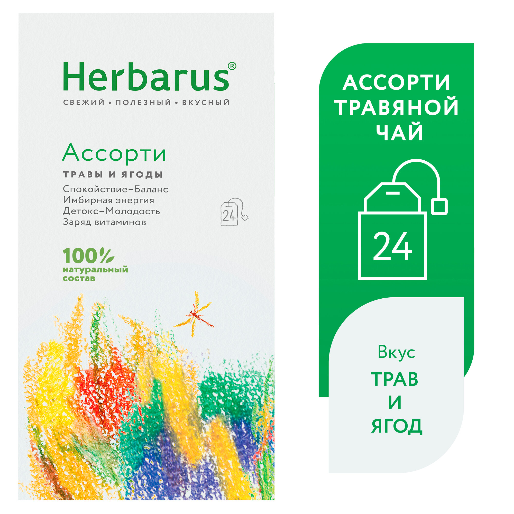 Яркий неповторимый вкус и только натуральные ингредиенты – перед вами чай и чайные напитки HERBARUS.● Полезный, без ароматизаторов и заменителей вкуса В напитках HERBARUS – только натуральные ингредиенты, тщательно сбалансированные титестерами. Оригинальные композиции созданы на основе чая, трав, ягод и фруктов. Их полезные свойства дополняют друг друга – чтобы вы могли пить чай в течение всего дня. Сколько хотите.● Вкусный Благодаря оригинальной рецептуре наши напитки обладают ярким и неповторимым вкусом. Даже композиции из привычных ингредиентов способны вас удивить. ● Свежий Чай должен быть свежим. Только в этом случае он будет по-настоящему вкусным и ароматным. Набор популярных вкусов в одной упаковке "Ассорти" - позволит познакомиться с неповторимыми купажами!Травяной чай в пакетиках "Спокойствие Баланс", 6 пак.Благородное освежающее сочетание трав и ягод на основе композиции из мяты, шиповника и мелиссы с богатым послевкусием. Травы, входящие в купаж, обладают умеренно успокаивающим действием, благотворно влияющим на нервную систему. Созданный на основе полезных трав, купаж этого чая станет вашим любимым!Травяной чай с Ромашкой и Мятой в пакетиках "Детокс Молодость", 6 пак.Изысканный купаж на основе классического сочетания ромашки и мяты с добавлением ароматных трав. Ингредиенты, входящие в купаж, обладают легким очищающим действием и способствуют ускорению метаболизма. Напиток хорошо сочетается с цветочным мёдом.Травяной чай в пакетиках "Заряд Витаминов", 6 пак.Освежающий, тонизирующий напиток с выраженной кислинкой и цитрусовым оттенком. Богат витаминами, особенно витамином С. Ингредиенты, входящие в купах, обладают легким противопростудным действием. Напиток можно употреблять в горячем и холодном виде.Можно пить в любое время дня. Травяной чай с Имбирём в пакетиках "Имбирная Энергия", 6 пак.Острый, жгучий настой имбиря, усиленный пикантными акцентами специй и цитрусовым вкусом. Согревающий, тонизирующий напиток, обладающий выраженным согревающим действием. Ингредиенты купажа известны противопростудным эффектом. Напиток хорошо сочетается с мёдом и лимоном.