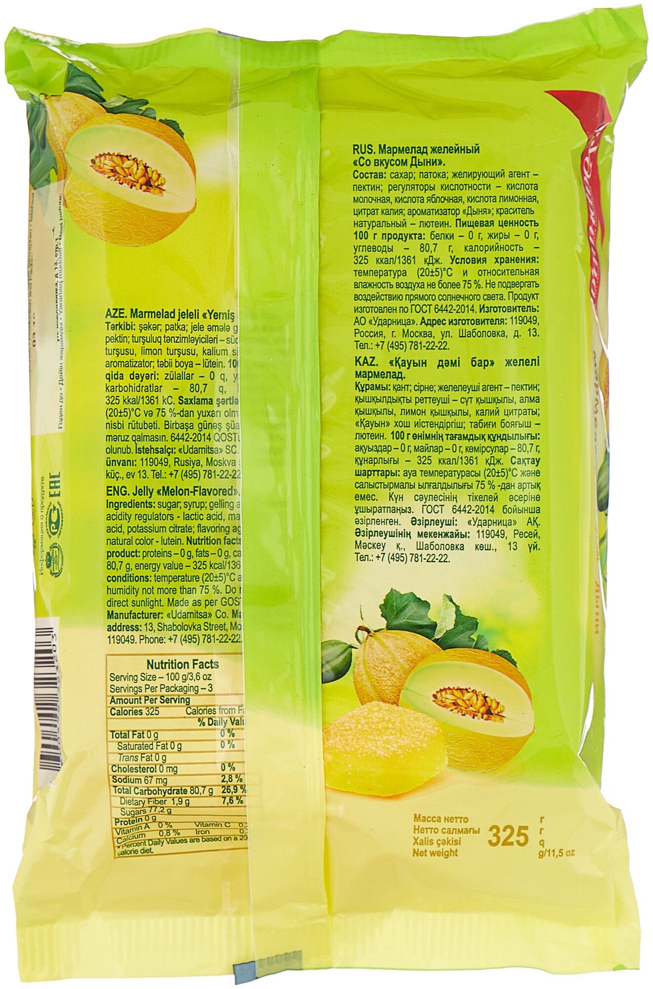 | Состав | Сахар-песок; патока; желирующий агент - пектин; регулятор кислотности - кислота молочная, кислота яблочная, кислота лимонная, цитрат натрия; ароматизатор; краситель натуральный - лютеин |