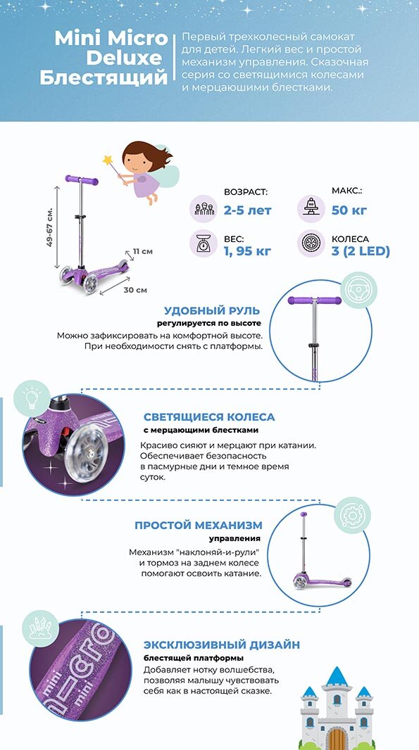 Детский самокат Mini Deluxe Блестящий LED со светящимися колёсами от известного швейцарского бренда Micro. Разработан специально для детей от 2-х до 5-ти лет. Откройте для себя мир чудес с самокатом Mini Micro Deluxe Блестящий LED. Тщательно выполненный в соответствии со швейцарским дизайном, этот самокат представляет собой очаровательное сочетание стиля и функциональности. Блестящая дека добавляет нотку волшебства, создавая ослепительный аттракцион, который заставит вашего малыша почувствовать, что он скользит по сказке. Но волшебство на этом не заканчивается! Волшебные светодиодные колеса - настоящие звезды шоу. Инкрустированные блестками и предназначенные для того, чтобы светиться во время движения, эти колеса создают завораживающее зрелище, поскольку они мерцают и сияют. Это зрелище приведет в восторг как детей, так и взрослых. Технические характеристики: · Уникальный механизм управления («наклоняй-и-рули») · Тормозной механизм на заднем колесе · Колёса (120/80 мм) с led-подсветкой · Высота руля регулируется от 49 до 67 см · Материал доски — GFK (полимерный стеклопластик) 30*11 см · Максимальная нагрузка до 50 кг Самокат Mini Micro Deluxe Блестящий LED обеспечивает максимально комфортное и безопасное катание для Вашего малыша в пасмурные дни и темное время суток. Добавьте яркости и блесток ежедневным прогулкам Вашего малыша!