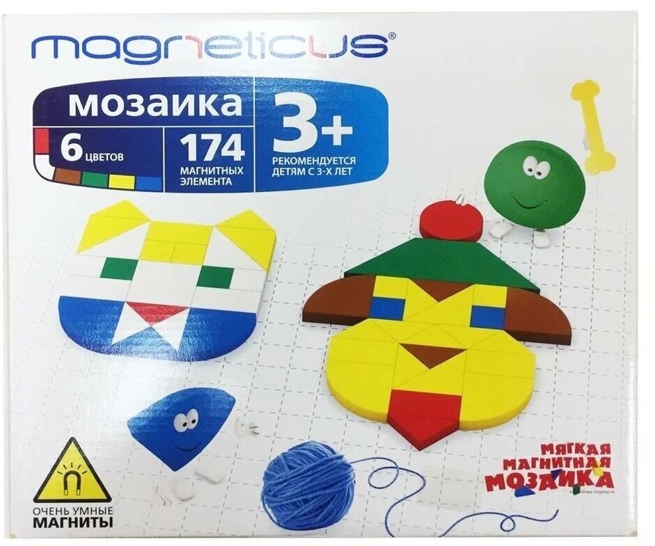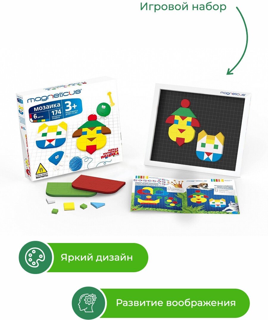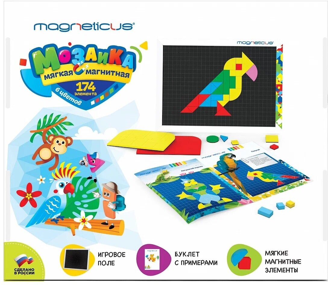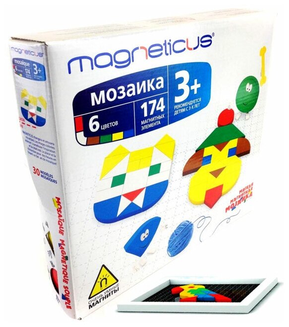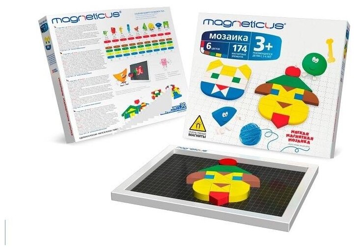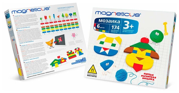 | Состав набора | 174 х Магнитных элемента 1 х Магнитное игровое поле 1 х Буклет с примерами |