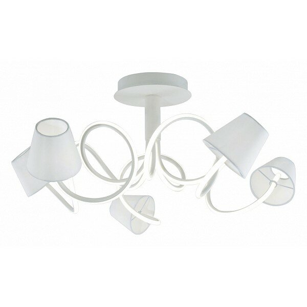 Белый цвет основания позволяет гармонично сочетать люстру с любым цветовым решением интерьера. Изящно изогнутые плафоны придают люстре оригинальность. Белый силикон плафонов мягко рассеивают свет. Эффектной изюминкой люстры является возможность комбинировать современное светодиодное освещение и классические текстильные абажуры. Благодаря стильному дизайну и высокому качеству, этот светильник станет прекрасным дополнением к любому интерьеру, принося в него индивидуальность и яркость. Светодиодные источники света экономичны и безопасны. Металлическое основание потолочной люстры окрашено в белый цвет. Корпус плафонов изогнутой формы выполнен из сплава алюминия с цинком и окрашен в цвет основания. Двухслойные абажуры состоят из текстиля белого цвета и термостойкого акрила с внутренней стороны. Абажуры прошиты. Светодиодные источники света закрыты белым силиконом.