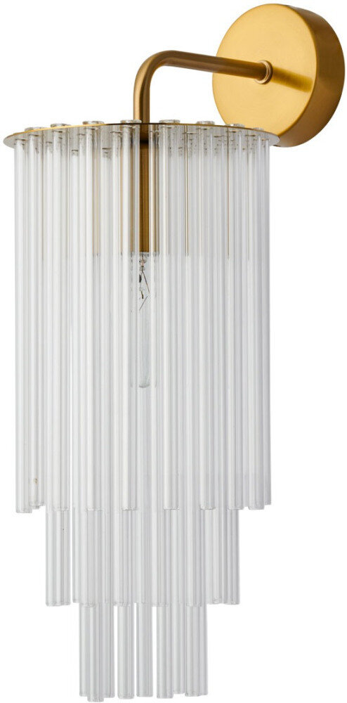 Гальваника в цвет латуни придает настенному бра благородный вид. Стеклянный декор создает уникальную игру света и тени и создает особый шарм и уникальность. Светильник идеально подходит для расслабляющих вечеров или романтических ужинов. Заменяемые источники света удобны в эксплуатации. Металлическое основание настенного бра гальванизировано в цвет латуни. Светильник декорирован прозрачными стеклянными трубочками.