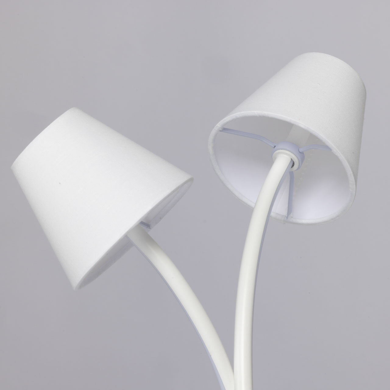 Белый цвет основания позволяет гармонично сочетать настольную лампу с любым цветовым решением интерьера. Изящно изогнутые плафоны придают настольному светильнику оригинальность. Белый силикон плафонов мягко рассеивают свет. Эффектной изюминкой лампы является возможность комбинировать современное светодиодное освещение и классические текстильные абажуры. Благодаря стильному дизайну и высокому качеству, этот светильник станет прекрасным дополнением к любому интерьеру, принося в него индивидуальность и яркость. Светодиодные источники света экономичны и безопасны. Металлическое основание настольной лампы окрашено в белый цвет. Корпус плафонов изогнутой формы выполнен из сплава алюминия с цинком и окрашен в цвет основания. Двухслойные абажуры состоят из текстиля белого цвета и термостойкого акрила с внутренней стороны. Абажуры прошиты. Светодиодные источники света закрыты белым силиконом.