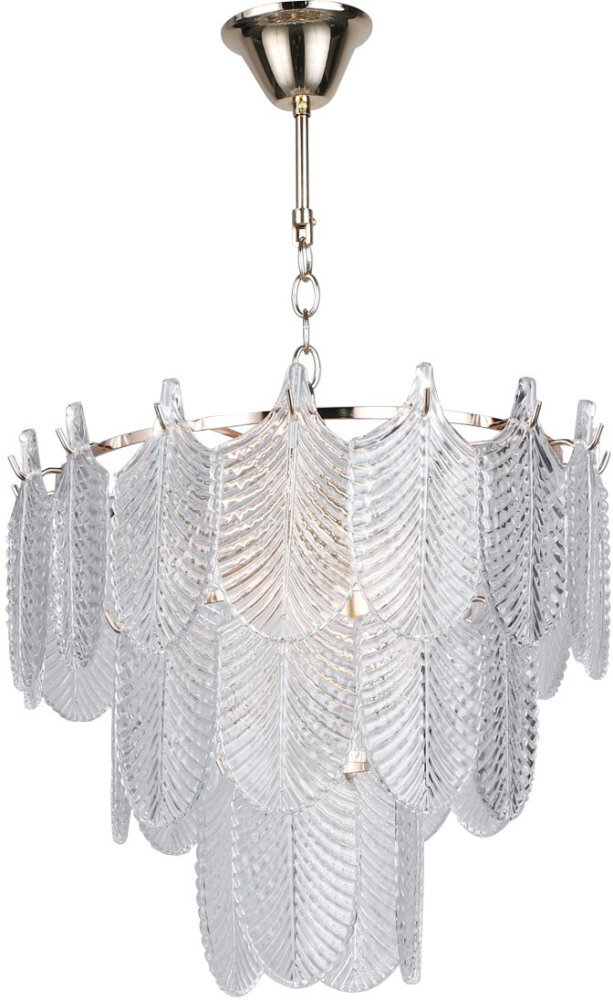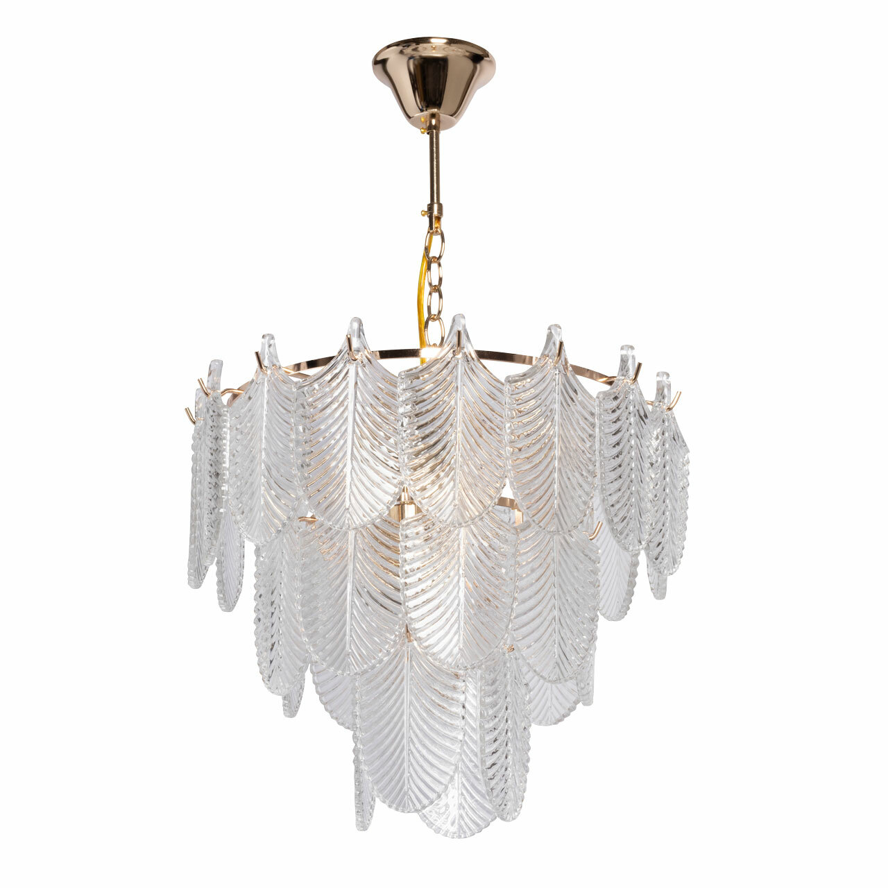 Цвет золота придает люстре элегантности. Стеклянный декор в форме листьев добавляет природной красоты. Сочетание материалов, форм и оттенков создает впечатляющий визуальный эффект и привлекает внимание к светильнику. Заменяемые источники света удобны в эксплуатации. Возможность регулировать комфортную высоту. Металлическое основание подвесной люстры гальванизировано в цвет золота. Светильник декорирован прозрачными стеклянными пластинами в форме листьев.