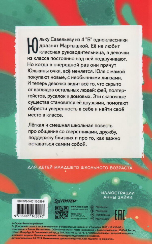 Юльку Савельеву из 4 "Б" одноклассники дразнят Мартышкой. Её не любит классная руководительница, а девочки из класса постоянно над ней подшучивают. Но когда в очередной раз они прячут Юлькины очки, всё меняется. Юля с мамой покупают новые, с необычными линзами. И теперь девочка видит всё то, что скрыто от взглядов остальных людей: фей, полтергейстов, русалок и домовых. Эти сказочные существа становятся её друзьями, помогают обрести уверенность в себе и найти своё место в классе. Лёгкая и смешная школьная повесть про общение со сверстниками, дружбу, поддержку близких и про то, как важно оставаться самим собой. Для детей младшего школьного возраста.5 причин прочитать эту книгу:Сказочные персонажи фея, барабашка, русалка превращают школьную повесть в фэнтези.Школьная история, описывающая ситуации и проблемы, которые знакомы каждому.Выразительные и динамичные персонажи от Анны Зайки.Легкий слог автора Елены Пальвновой, детского писателя, поэта, переводчика, которой особенно удаются юмористические рассказы.В книге можно найти реальные способы справиться с травлей одноклассников и непониманием учителей.