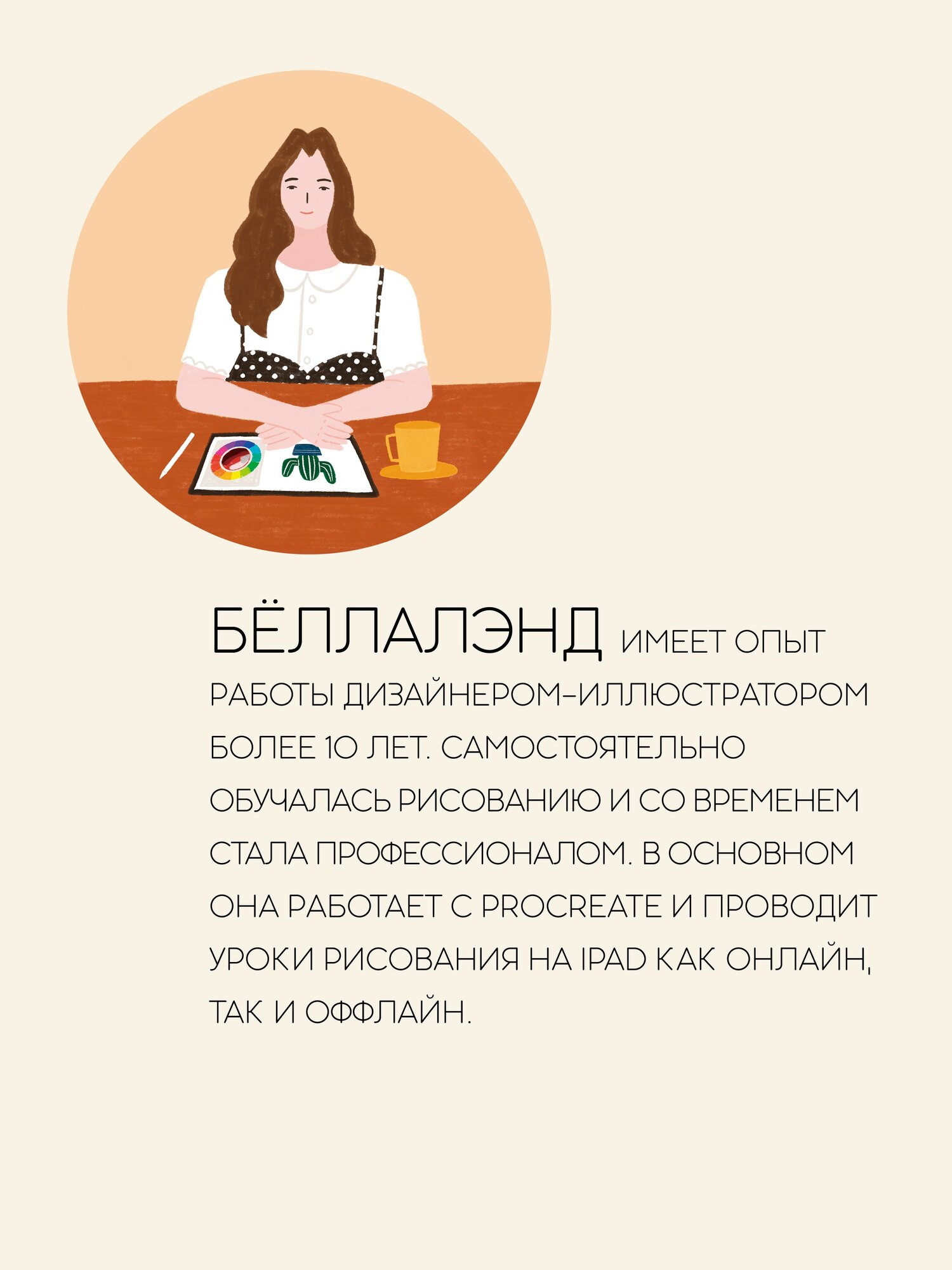 Может ли цифровой рисунок вызывать такие же сильные эмоции, как и рисунки в традиционной технике? Корейский иллюстратор Бёллалэнд уверена, что да! Она приглашает всех начинающих художников погрузиться в мир диджитал-рисования с помощью приложения Procreate, которое уже приобрело невероятную популярность. В книге описаны основы авторской техники, позволяющей создавать на iPad такие же милые и атмосферные иллюстрации, как и на бумаге. Художница также делится практическими советами и рассказывает вдохновляющую историю своего творческого пути.Прочитав эту книгу, вы:Освоите интерфейс Procreate.Узнаете о множестве полезных функций приложения.Научитесь изображать на iPad как предметы, так и людей.Сможете создать собственный мерч.Начнете искать свой уникальный стиль рисования.БОНУС ОТ АВТОРА: СКАЧАЙТЕ КАСТОМНЫЕ КИСТИ ПО QR-КОДУ ВНУТРИ КНИГИ!5 причин прочитать эту книгу:Профессиональные лайфхаки, которые помогут вам освоить основы цифрового рисунка и улучшить свои навыки в этой области.Procreate является одним из самых популярных приложений для началы работы с цифровым рисунком, поэтому изучение его интерфейса и возможностей будет полезно для любого начинающего художника.С помощью этого руководства вы не только освоите программу и научитесь изображать предметы, атмосферное пространство и людей, но и сможете создать собственный мерч!Бонусом от автора являются кастомные кисти, которые можно скачать по QR-коду внутри книги. Это сэкономит время на поиски качественных кистей и позволит сразу приступить к созданию своих уникальных иллюстраций.История автора, опытного иллюстратора, о ее творческом пути может стать источником вдохновения для вас и помочь преодолеть возможные трудности в процессе обучения.