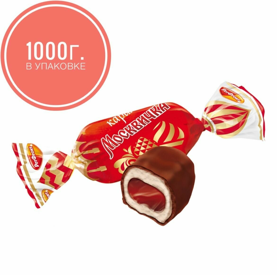 Легендарная конфета «Москвичка» фабрики «Рот Фронт» – это хрустящая белая карамель, покрытая шоколадной глазурью. Внутри конфеты – нежная помадная начинка с добавлением какао, сгущенного молока и терпким коньячным ароматом. Вкус, знакомый многим поколениям, сочетание твердой карамели и тающей мягкой начинки.