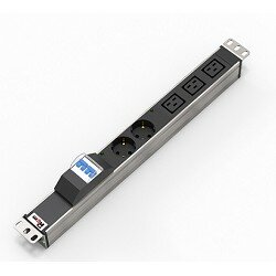 Блок силовых розеток имеет три порта IEC 60320 C19 и два порта Schuko, выполнен в анодированном алюминиевом корпусе. Розетки расположены горизонтально, для удобного подсоединения коленчатых штекеров. На лицевой части блока установлен автомат с индикатором. Вход кабеля питания - клемная колодка. Кабель питания в комплект поставки не входит. Совместим со всеми линейками 19 монтажного оборудования. Поставляется в индивидуальной упаковке с комплектом крепежа. Выполнен в системе несущих конструкций 482,6 мм по ГОСТ 28601.2 (19-дюймовые конструктивы по МЭК 297).