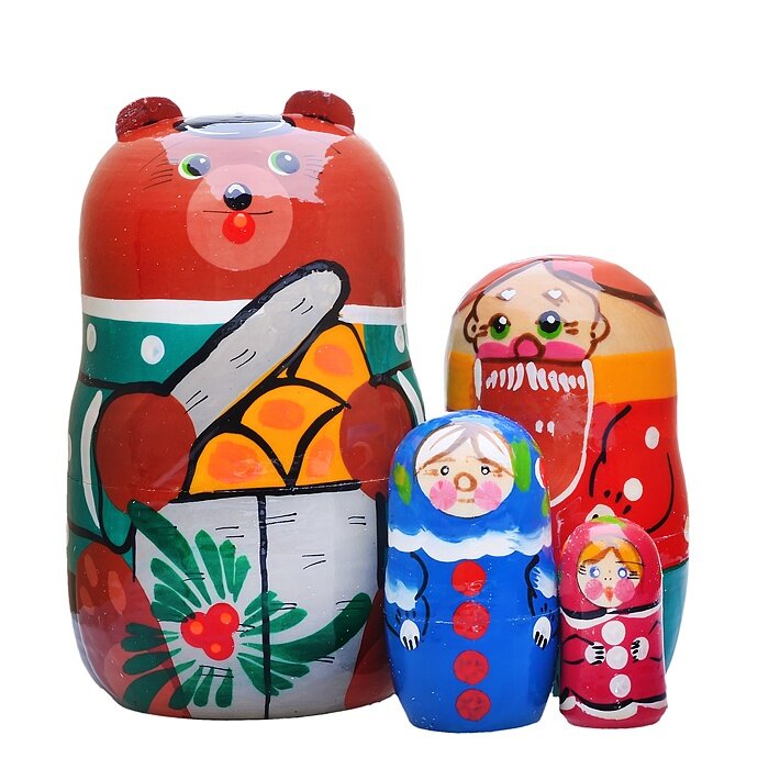 Матрешка - традиционная деревянная игрушка. Фигурки вкладываются одна в другую, только самая маленькая матрешка не является разъемной. Игрушка сделана из натурального дерева. Каждая матрешка расписана вручную мастером, поэтому уникальна и неповторима! Матрешка Маша и Медведь расписана по мотивам одноименной сказки. В комплекте - 4 фигурок.
