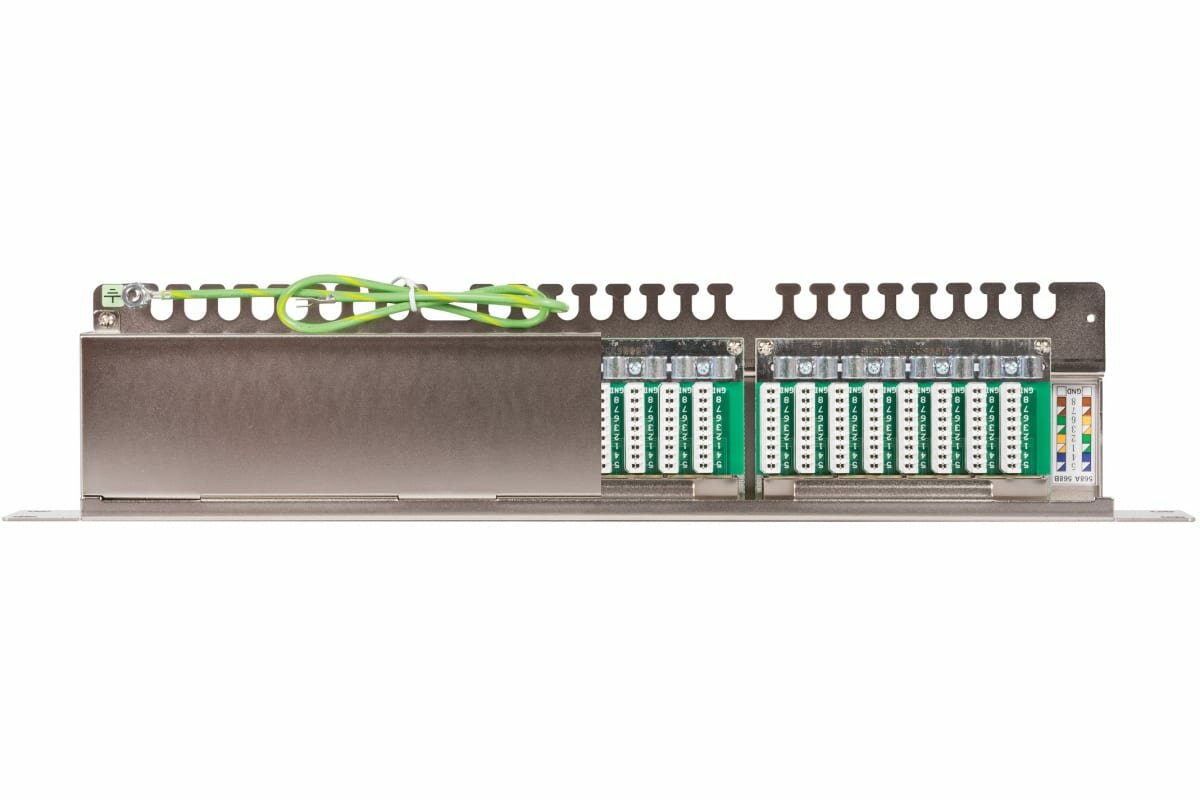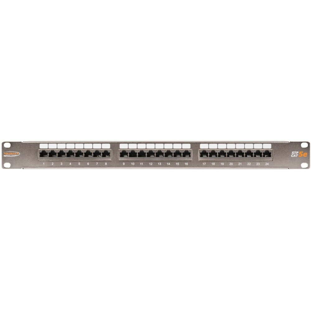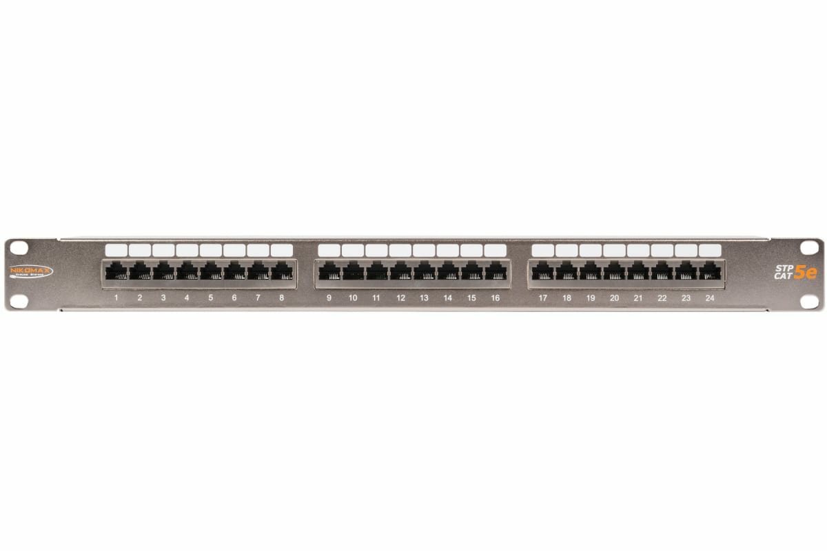 Коммутационная патч-панель Nikomax предназначена для монтажа кабелей в различных подсистемах СКС и подключения отдельных составляющих сети друг к другу при помощи коммутационных шнуров. Патч-панель выполнена в стальном, полностью экранированном корпусе и предназначена для монтажа в 19 шкафы или стойки. Панель имеет стандартную высоту в 1U и вмещает 24 порта RJ45/8P8C. Универсальные IDC контакты 110/KRONE расположены с тыльной стороны панели, на горизонтальной подложке. Разводка кабелей на патч-панели производится по двум стандартам: T568 А и B. Экраны кабелей попарно заземляются на винтовые клеммы. Предусмотрен 9-й заземляющий IDC-контакт - специально под дренажный проводник кабеля. С обеих сторон печатных плат имеются общие шины заземления. Для лучшего экранирования от электромагнитных помех и улучшения связи с неокрашенными направляющими шкафа, стальной корпус панели гальванизирован никелем. Предусмотрен встроенный органайзер для надежного закрепления кабелей.
