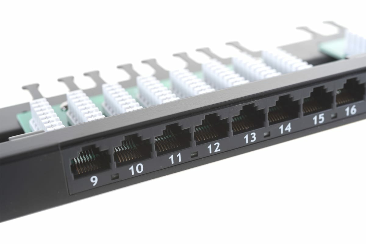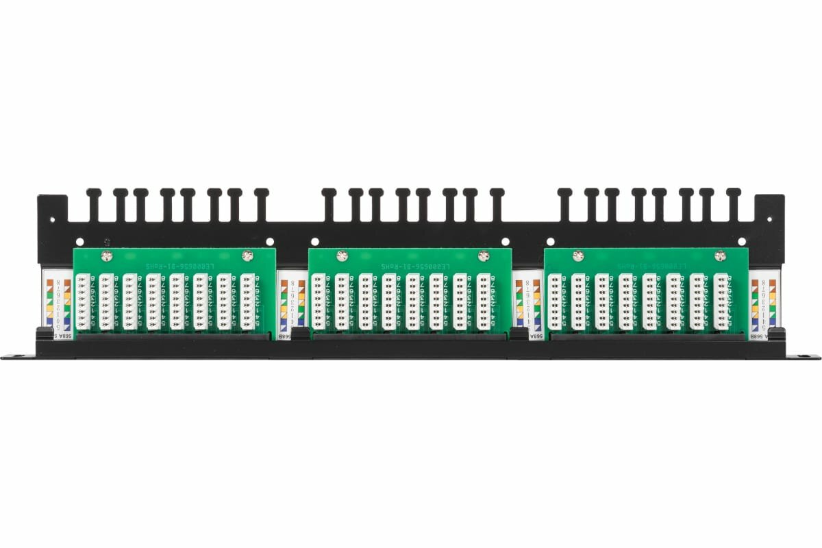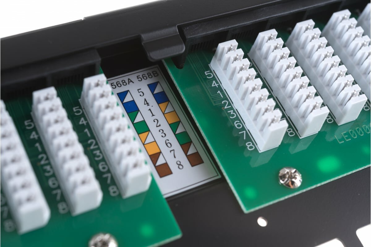 Коммутационная патч-панель Nikomax предназначена для монтажа кабелей в различных подсистемах СКС и подключения отдельных составляющих сети друг к другу при помощи коммутационных шнуров. Панель выполнена в неэкранированном корпусе и предназначена для монтажа в 19 шкафы или стойки. Вмещает 24 порта RJ45/8P8C при высоте всего 0,5U. Такое решение идеально, когда необходимо обеспечить высокую плотность портов (например, в дата-центрах) или для расширения сети в ограниченном пространстве шкафа. Универсальные IDC контакты 110/KRONE расположены с тыльной стороны панелей, на горизонтальной подложке. Разводка кабелей на патч-панели производится по двум стандартам: T568 А и B. Предусмотрен встроенный органайзер для надежного закрепления кабелей.