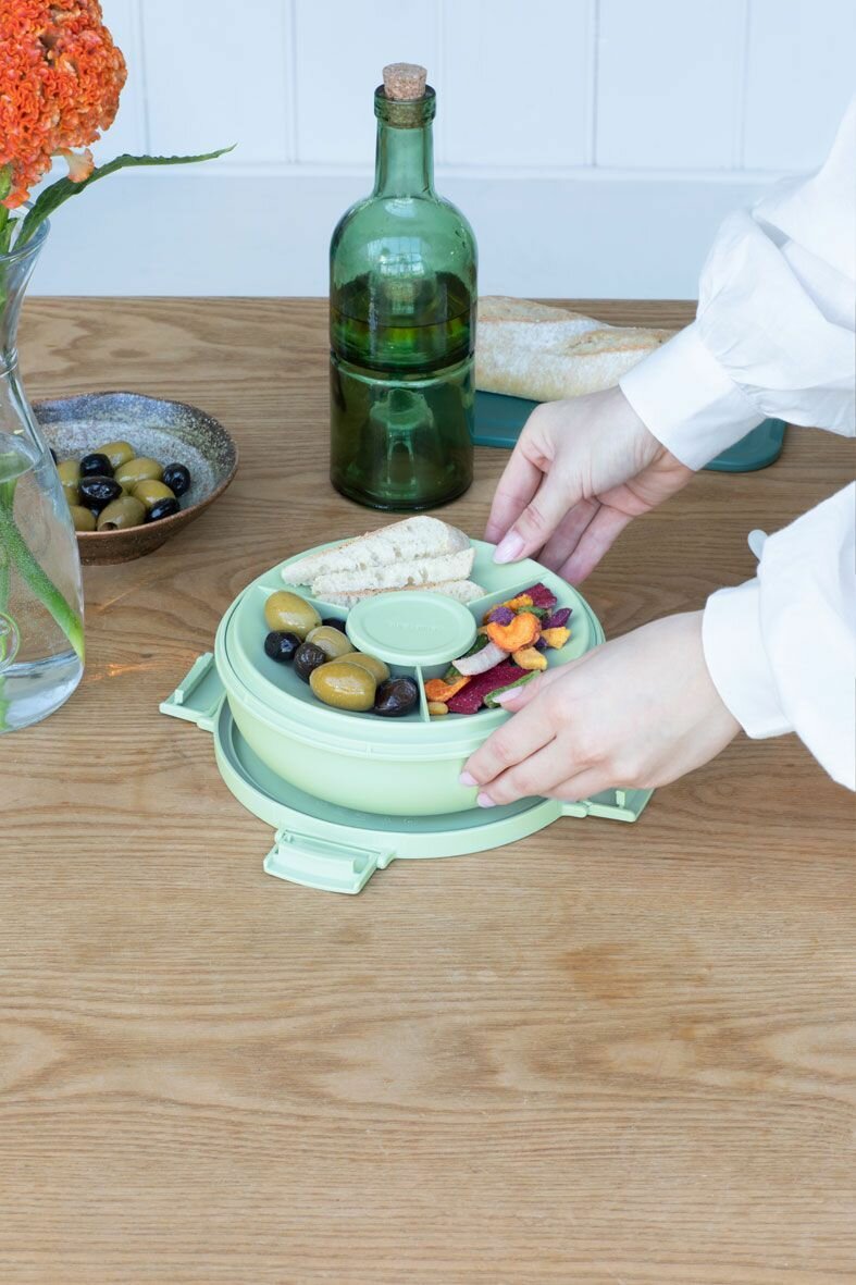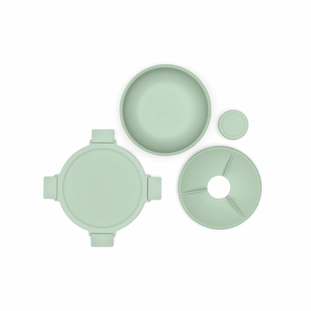 Раздельное хранение ингредиентов - сегментированная вставка для ингредиентов и соусник для заправки.