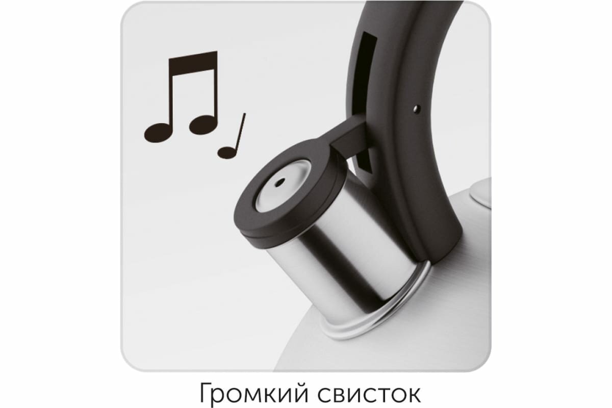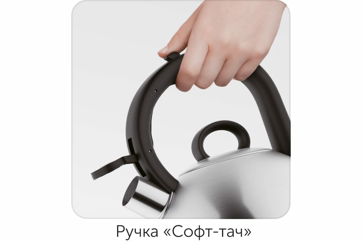 Чайник изготовлен из нержавеющей стали 18/10. Трёхслойное капсульное дно способствует равномерному разогреву. Эргономичная ручка с покрытием "софт-тач" не нагревается и оснащена удобной кнопкой для открывания крышки носика. Громкий свисток не позволит пропустить время закипания воды. Свисток широко открывается и позволяет наполнять чайник через носик.