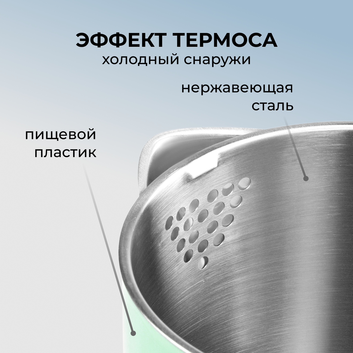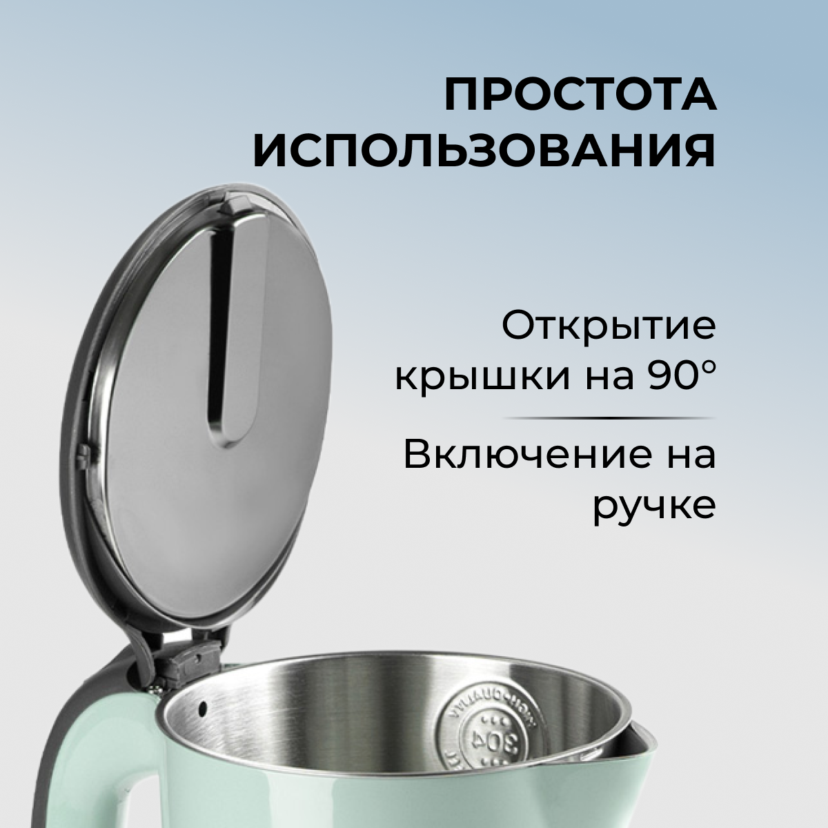Чайник имеет двойные стенки из нержавеющей стали класса 18/10 и пищевого пластика. Теплоизолирующий зазор (воздушная подушка) создаёт эффект термоса, сохраняя воду горячей долгое время. Чайник не нужно часто подогревать, что обеспечивает экономию электроэнергии. Внешняя часть корпуса выполнена из экологически безопасного пластика, на котором практически не заметны загрязнения и следы от капель воды. Об этот чайник невозможно обжечься. Внутренняя часть корпуса изготовлена из особой стали марки 18/10, которая устойчива к коррозии и воздействию солей при нагревании, а также препятствует размножению микробов.