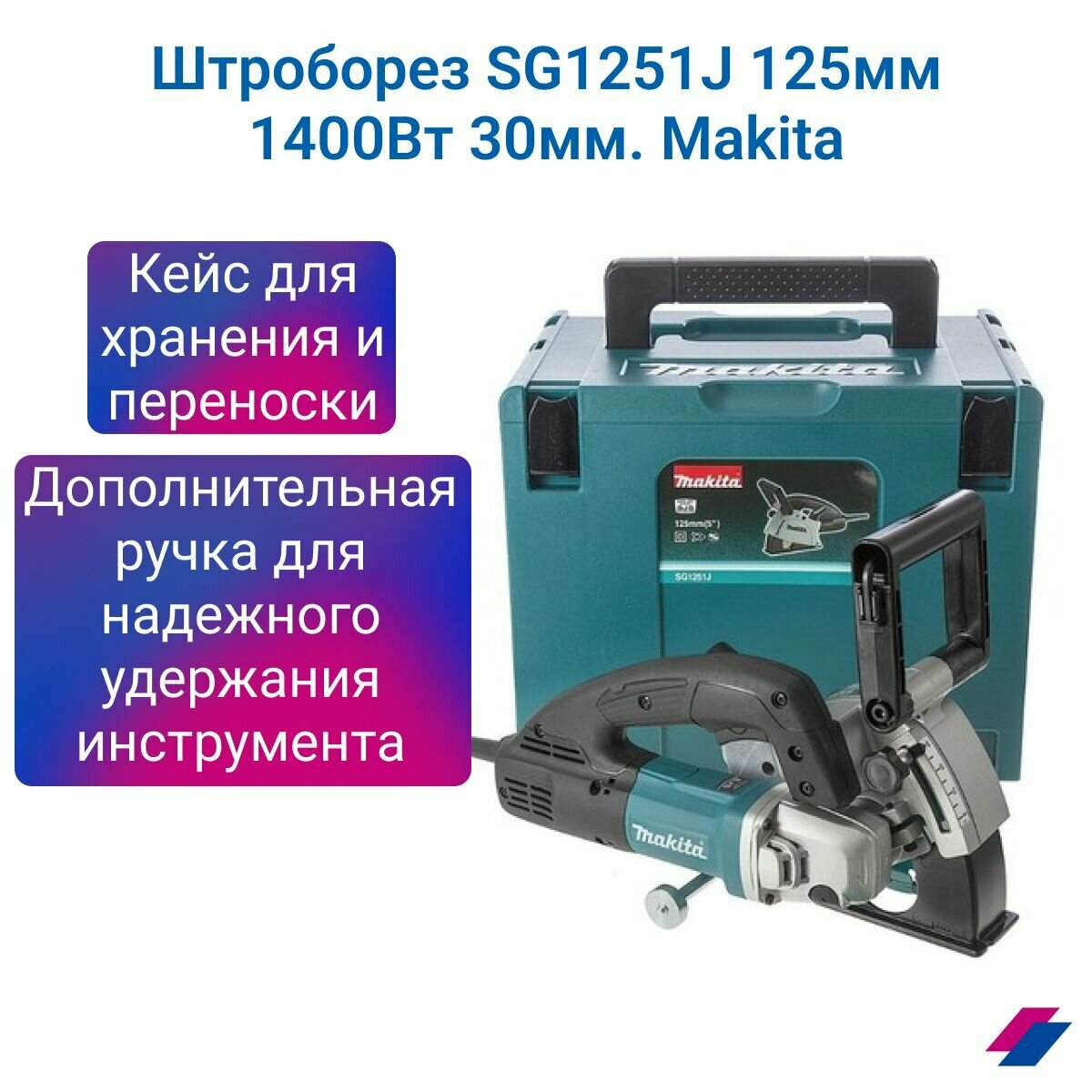 Штроборез MAKITA SG-1251J обладает следующими особенностями: Мощный (1400 Вт) двигатель и два алмазных диска делают возможным вырезание пазов в бетоне шириной и глубиной до 30 мм. Чистота рабочей зоны, компактность и удобство использования Штроборез от Makita предлагает наиболее эффективную вырезку пазов с чистой кромкой Эргономичная конструкция рукоятки обеспечивает комфортные условия работы Удобно расположенный передний кожух эффективно предотвращает разброс отходов резки при любой глубине паза В кейсе.
