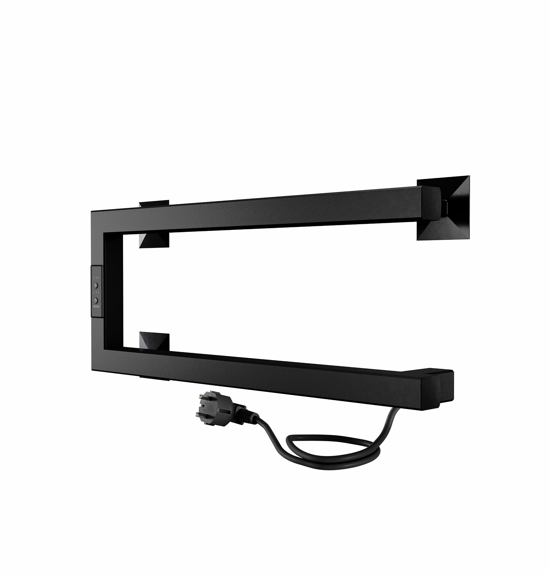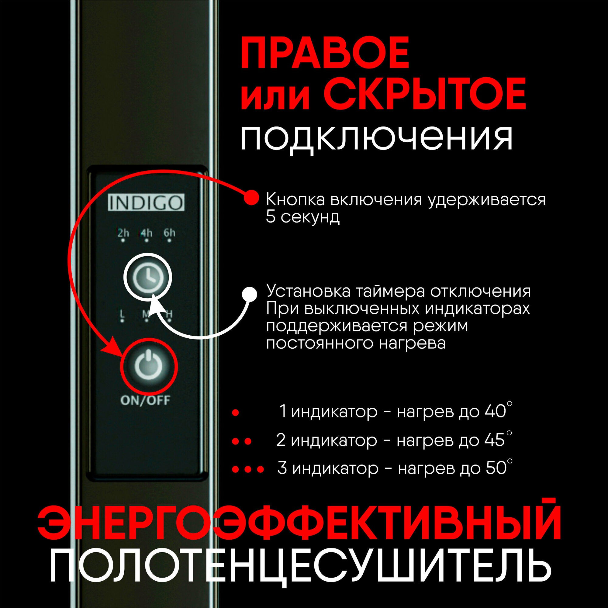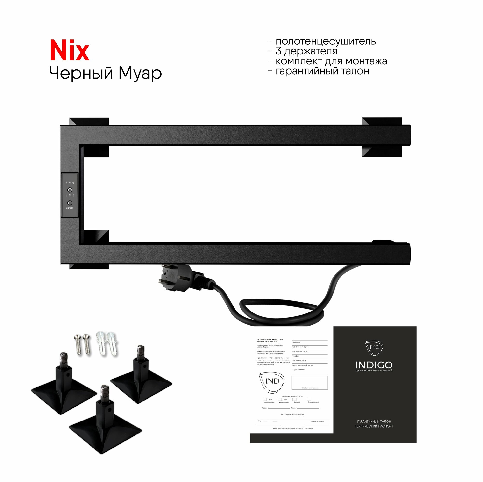 Полотенцесушитель электрический INDIGO Nix выполнен в цвете «Черный Муар». Матовость и равномерное покрытие изделию обеспечивает специальная технология окрашивания порошковой краской. На матовом покрытии не остаются отпечатки и разводы во время эксплуатации. Новая модель в двух исполнениях: с правым и левым подключением. Компактное изделие, не занимает много места, крепится на три держателя. Данную модель легко можно установить не только в ванной комнате, но и на кухне для просушки текстильных изделий.Не имеет замкнутого контура. Перекладины удобны для размещения текстильных вещей на просушивание. С помощью терморегулятора можно регулировать температуру в диапазоне от 40 до 50 градусов (с шагом 5 градусов) — уровень температуры показывается количеством горящих светодиодов. Таймер можно настроить на отключение через 2, 4, 6 часов.Подключение осуществляется двумя способами: скрытое подключение к электропроводке через модуль скрытого подключения в стену или прямым электропроводом длиной 1,1 метра в розетку. Данная модель полотенцесушителя подходит для размещения как в ванной комнате, так и на кухне, благодаря своей компактности и удобству монтажа.В комплектацию входят: 3 телескопических держателя, комплект монтажа (дюбели и саморезы), инструкция с гарантийным талоном на 3 года от производителя. Срок службы изделия не ограничен.