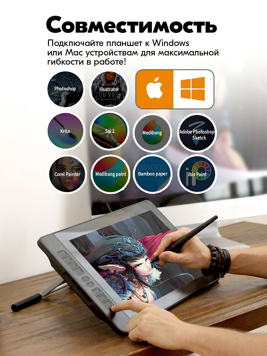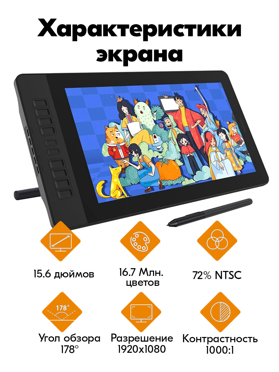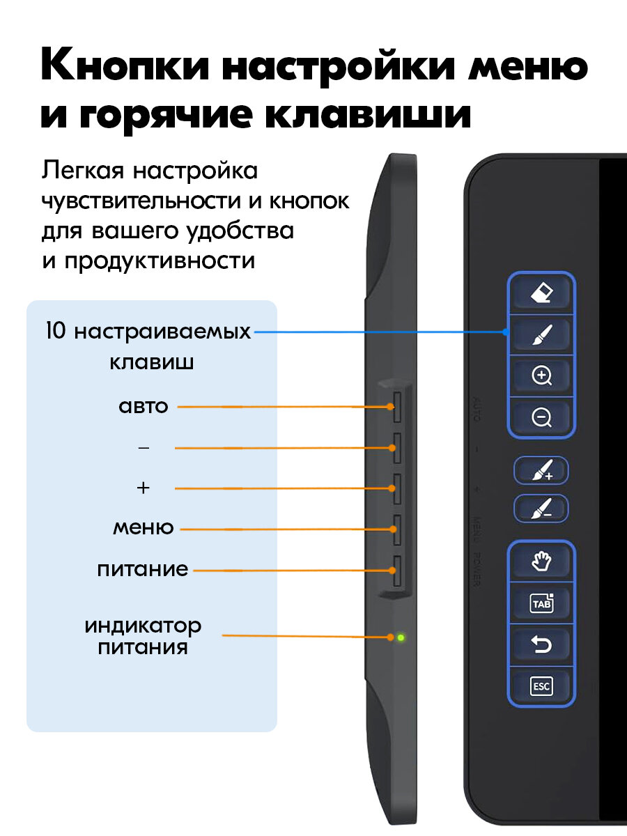 Дисплей с 72% цветовым охватом NTSC делает более реальным и живым любое воплощение Ваших работ10 программируемых экспресс-клавиш, которые помогут вам повысить эффективность и скорость работы и даже сложная комбинация клавиш необходимая для активации нужного Вам действия, может быть реализована одним нажатием кнопки